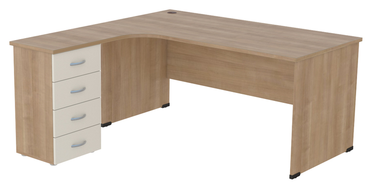 Rohový stůl se zásuvkami, bez výsuvu pro klávesnici, výsuv lze doobjednat. stůl je opatřen rektifikačními nožkami.Možnost výběru barev viz vzorník.Výběr pravého nebo levého provedení. Stůl je vyobrazen v levém provedení.