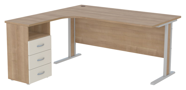 Kancelářský rohový stůl s kovovou podnoží a zásuvkami a nikou, bez výsuvu pro klávesnici, výsuv lze doobjednat. Možnost výběru barvy (viz vzorník ). Možnost výběru orientace stolu pravá nebo levá.Vyobrazeno v levém provedení.