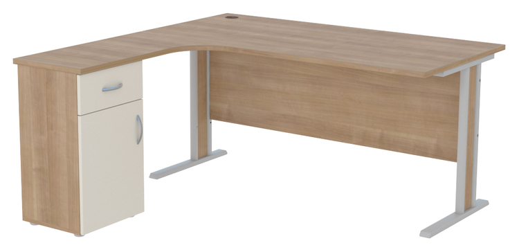 Kancelářský rohový stůl s kovovou podnoží, se skříňkou a zásuvkou, bez výsuvu pro klávesnici, výsuv lze doobjednat. Možnost výběru barvy (viz vzorník ). Možnost výběru orientace stolu pravá nebo levá. Vyobrazeno v levém provedení.