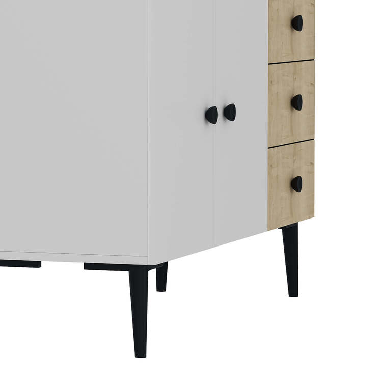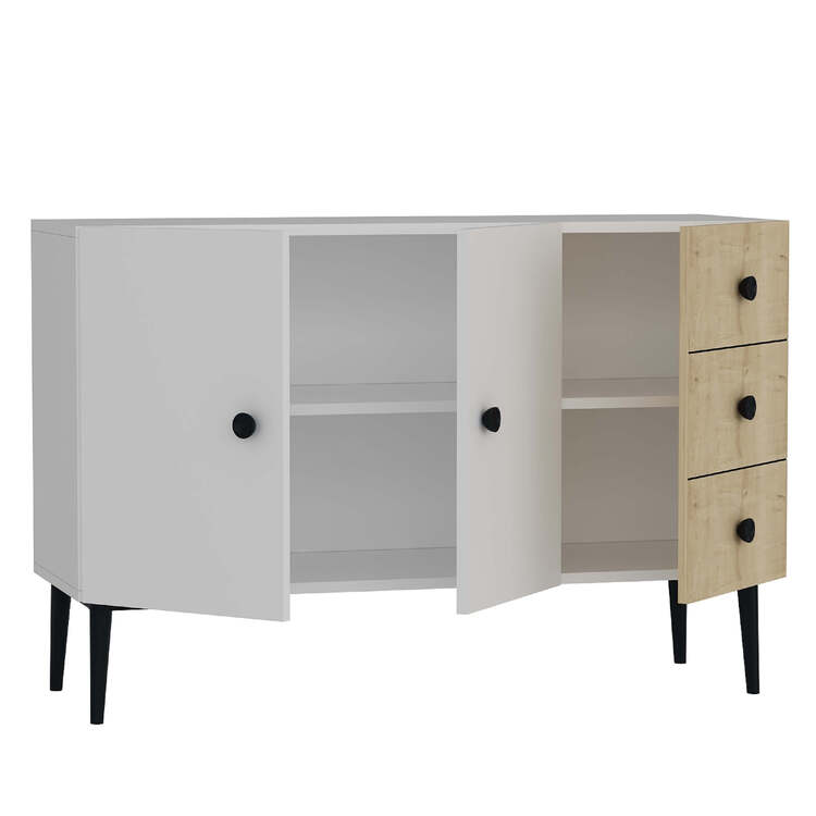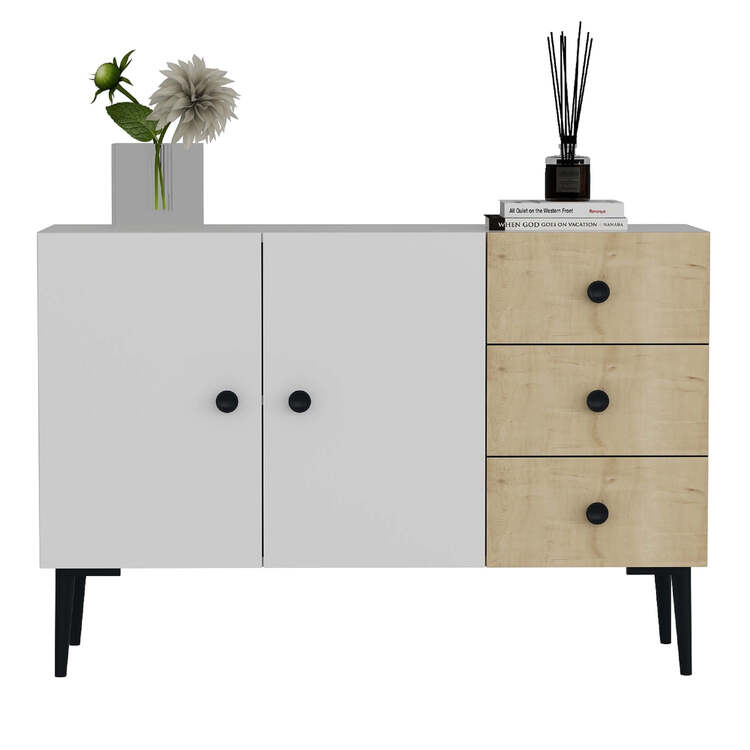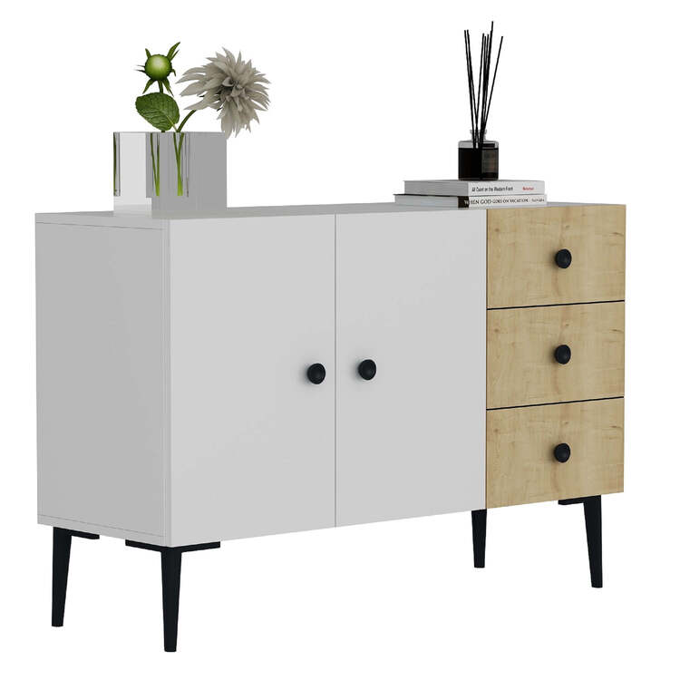 Komoda je perfektní volbou pro moderní obývací pokoj, kde kombinuje eleganci s praktickým úložným prostorem. S třemi plnými dvířky poskytuje dostatek místa pro uspořádání vašich věcí, ať už jde o knihy, dekorace nebo jiné drobnosti.