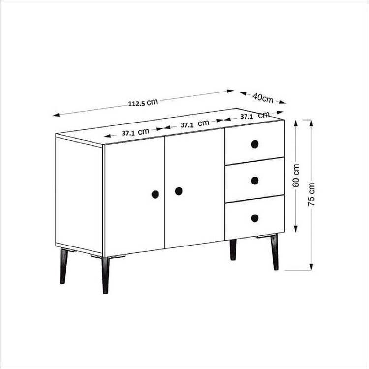 S rozměry 75 × 112.5 × 40 cm je komoda ideální pro efektivní využití prostoru. Vyrobena z kvalitního LTD materiálu o tloušťce 18 mm, zajišťuje pevnost a dlouhou životnost. Plastové úchytky a plastové nožičky přidávají moderní vzhled a zajišťují stabilitu.