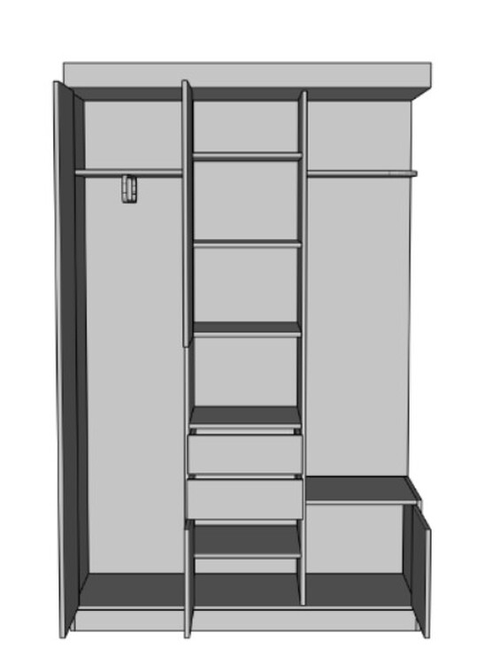 nabízí dostatek úložného prostoru díky 2 prostorným zásuvkám, četným policím a šatní skříni, která umožňuje přehledné uspořádání oblečení, kabátů či doplňků.