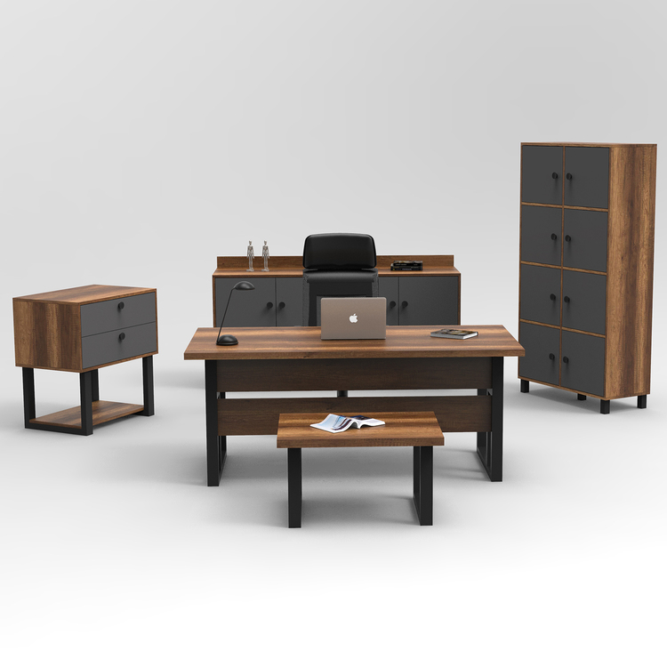 Kancelářský set je ideální volbou pro moderní pracovnu, která klade důraz na styl, funkčnost a dostatek úložného prostoru. Kombinace kvalitních materiálů LTD a kovu s industriálním designem přináší estetiku a odolnost, které uspokojí i ty nejnáročnější požadavky. Sestava zahrnuje psací stůl, konferenční stolek, malou komodu, konzoli a vysokou komodu, což tvoří kompletní řešení pro každodenní práci.