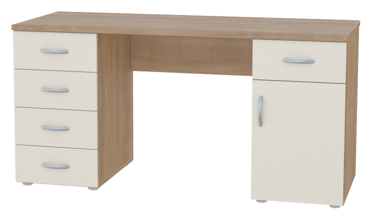 Psací stůl se šuplíky a dvířky. Možnost výběru barvy a úchytek viz vzorník. Barvy je možné vzájemně kombinovat dle Vašich představ, požadavek na kombinaci barev je nutné uvést do poznámky v objednávce. Možnost výběru levého nebo pravého provedení. Stůl je zobrazen v pravém provedení. Stůl má další rozměrové varianty viz varianty zboží. Dodáváno ve smontovaném stavu. Zakázková výroba.