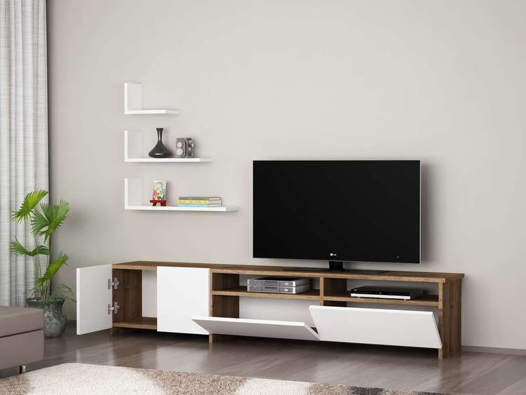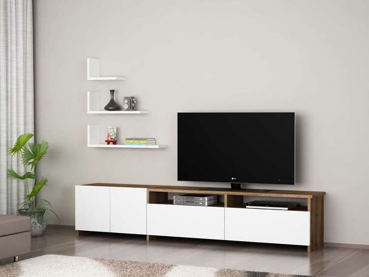 Představujeme obývací stěnu, která kombinuje moderní design a funkčnost, aby přinesla do vašeho obývacího pokoje styl a praktičnost. Tato elegantní sestava v kombinaci bílé a ořechové barvy je navržena tak, aby poskytovala estetické a praktické řešení pro vaše multimediální zařízení a další potřeby.