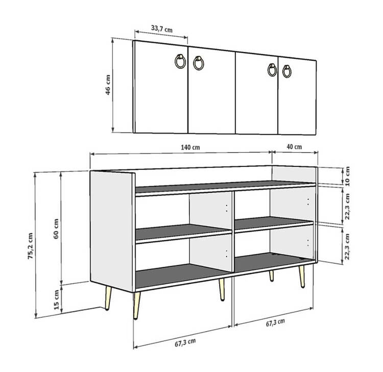 S rozměry 75.2 × 140 × 40 cm je skříňka široká a prostorná, což umožňuje efektivní uspořádání věcí. Vyrobena z kvalitního LTD materiálu o tloušťce 18 mm, zajišťuje pevnost a odolnost. Kovové úchytky a plastové nožičky dodávají moderní a elegantní vzhled a zároveň poskytují stabilitu.