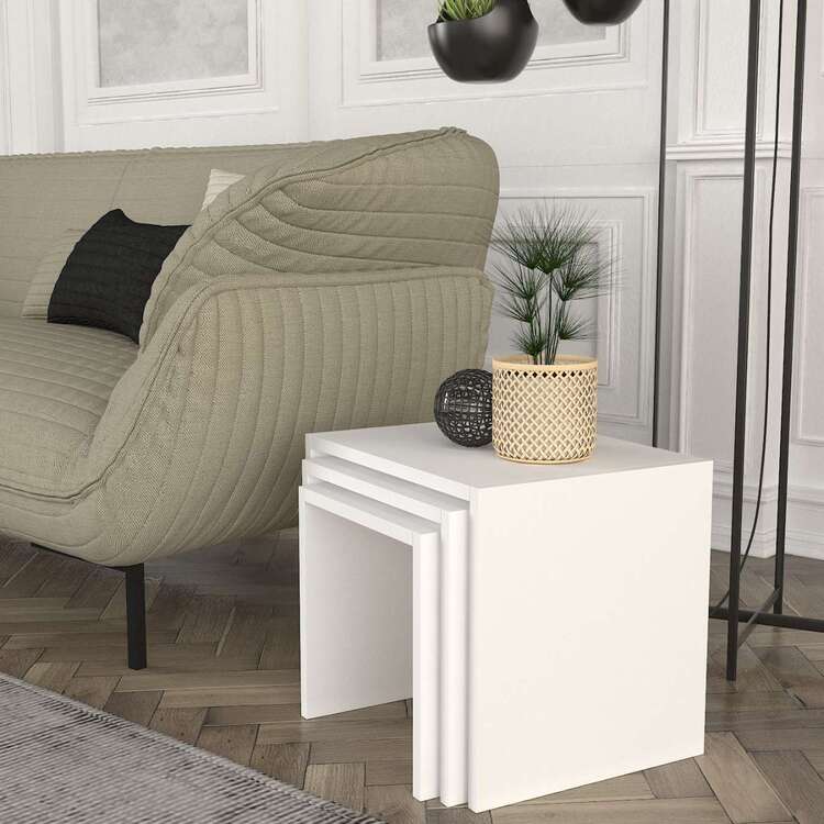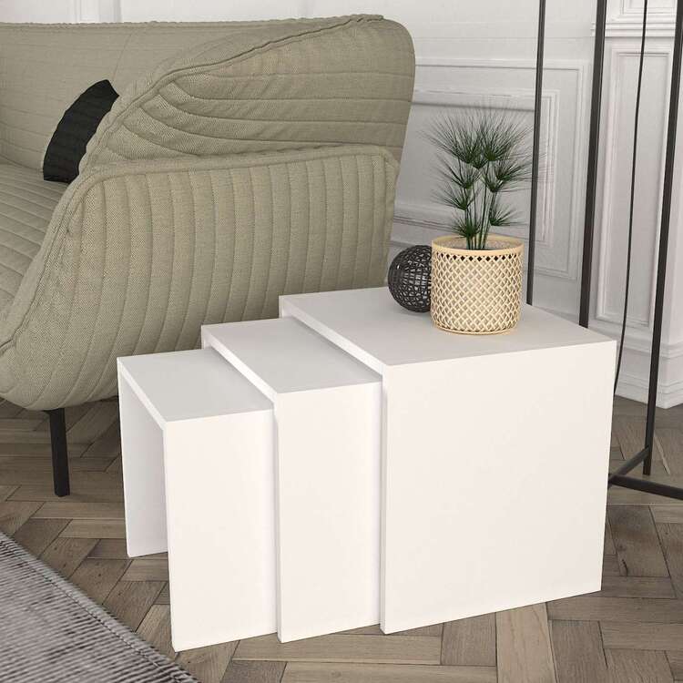 Stolek se pyšní svým čistým bílým designem a obdélníkovým tvarem, který je nejen praktický, ale i esteticky atraktivní. Sestava obsahuje tři odkládací stolky, které poskytují dostatek prostoru pro vaše knihy, časopisy či dekorace. Robustní LTD materiál o tloušťce 18 mm zajišťuje dlouhou životnost a pevnost tohoto stolku.