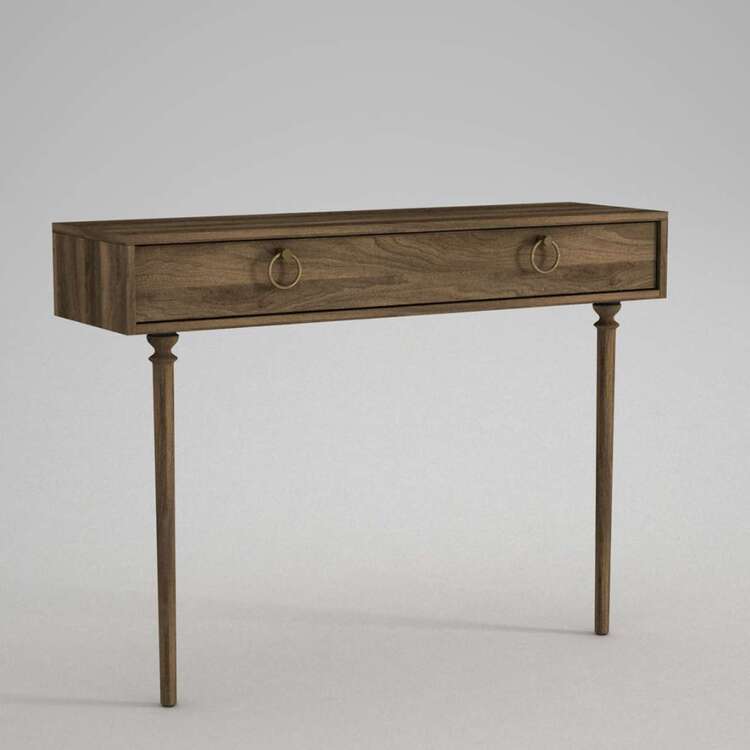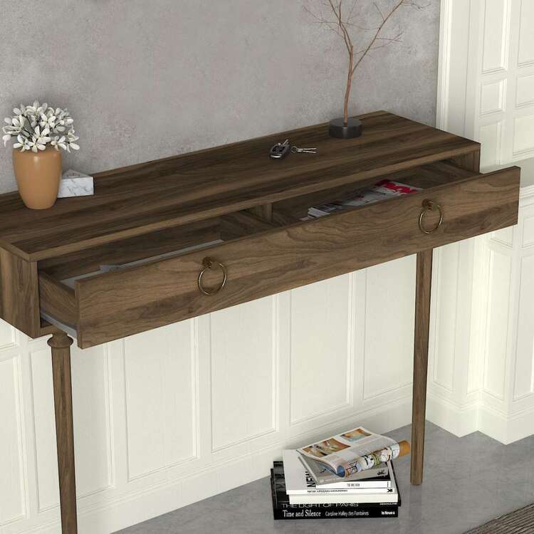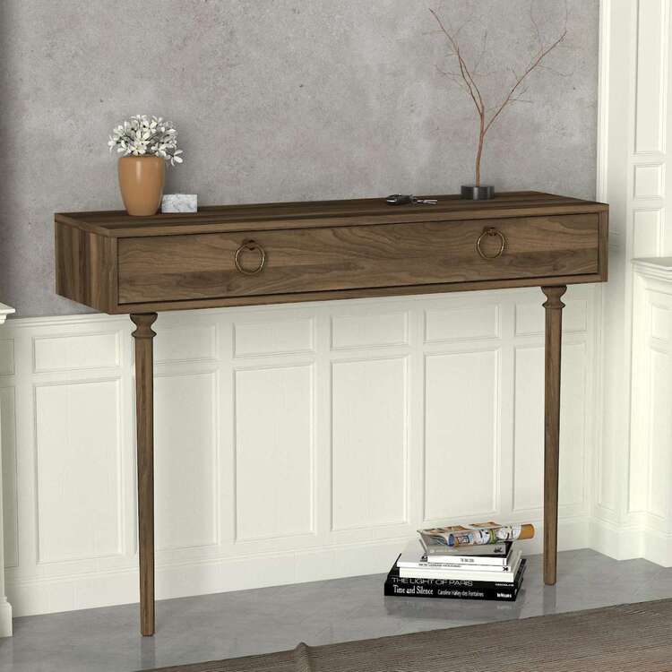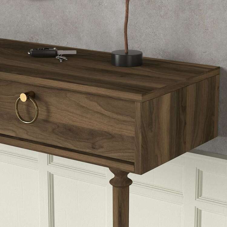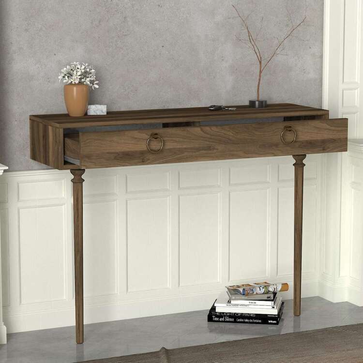 Konzolový stolek vyniká svou obdélníkovou konstrukcí a elegantní ořechovou barvou, která přináší do vašeho interiéru sofistikovaný vzhled. Praktická zásuvka poskytuje dostatek úložného prostoru pro vaše osobní věci, čímž zajišťuje, že váš prostor zůstane vždy uklizený a organizovaný.