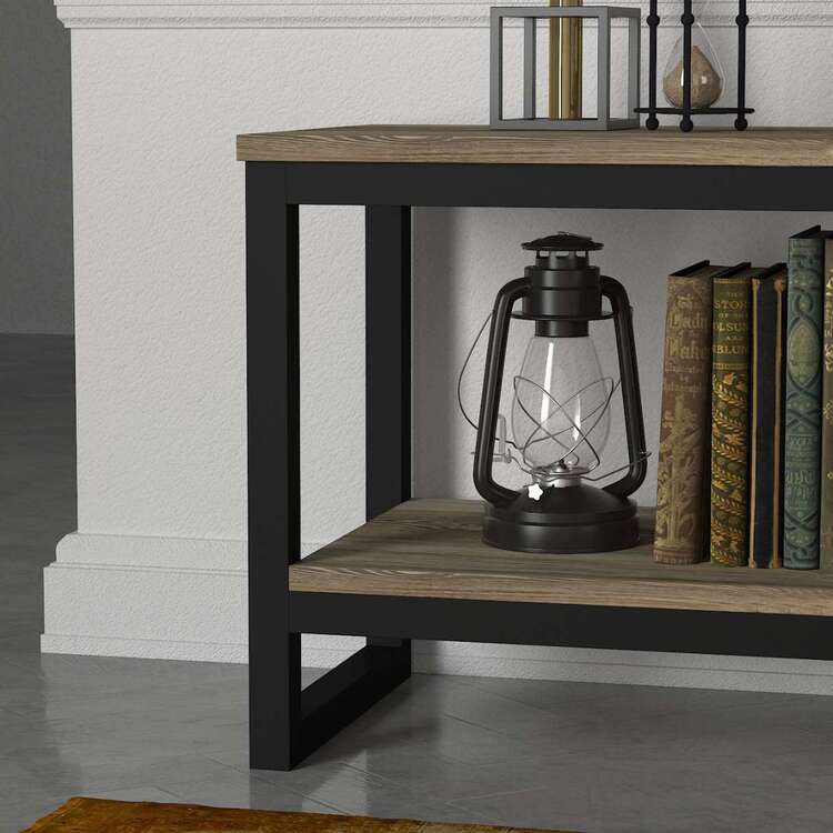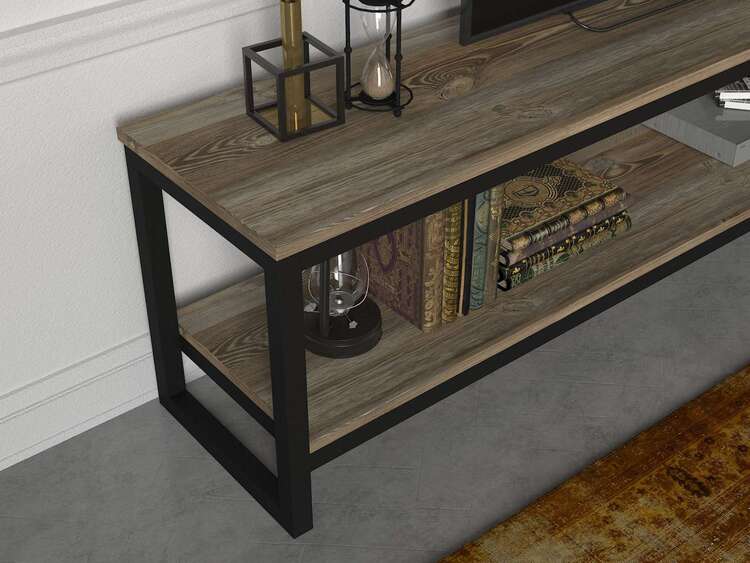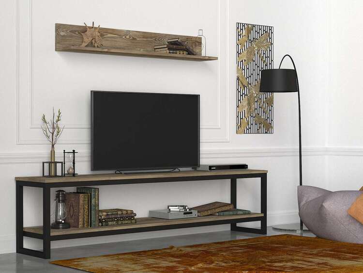 Představujeme obývací stěnu, která přináší do vašeho obývacího pokoje stylový loftový a industriální design. Tato stylová sestava v kombinaci hnědé a černé barvy je navržena tak, aby poskytovala praktické a estetické řešení pro vaše multimediální zařízení a další potřeby.