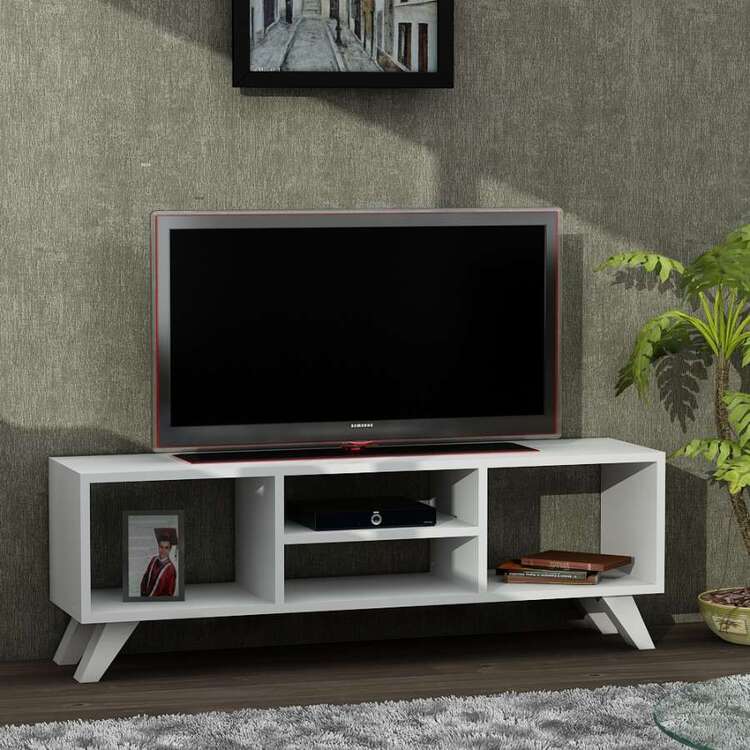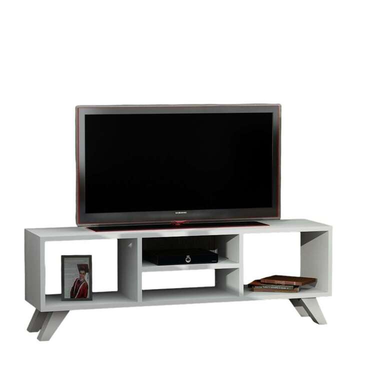 Objevte TV stolek, který je díky svému minimalistickému designu a čisté bílé barvě ideální pro moderní obývací pokoje. Tento kus nábytku poskytuje prostor pro uložení vašich multimediálních zařízení a dalších předmětů, a to vše bez zbytečných komplikací díky svému otevřenému designu.