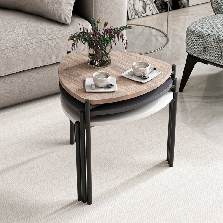 Set konferenčních stolků nabízí stylové a praktické řešení pro moderní obývací pokoje. Tato sada obsahuje tři stolky různých velikostí, které lze snadno kombinovat nebo používat samostatně. Design v barevném provedení bílá, antracit a ořech s kovovými nohami dodává stolkům nadčasový vzhled.