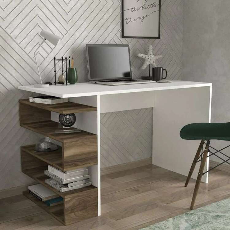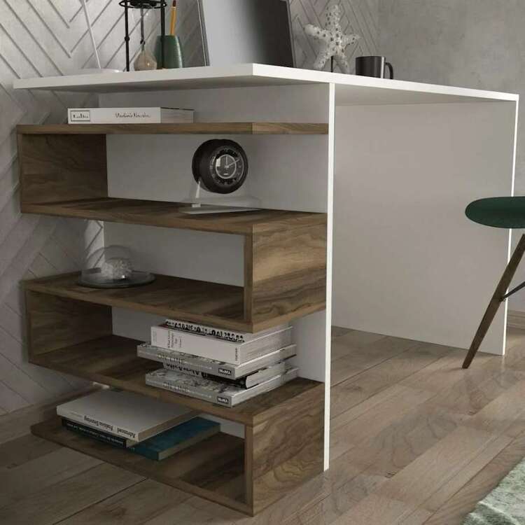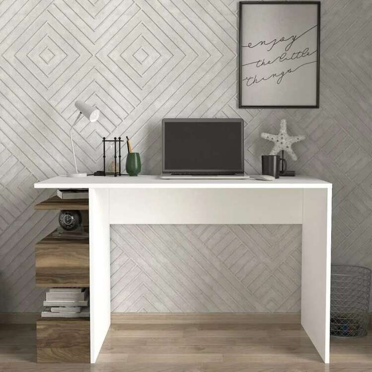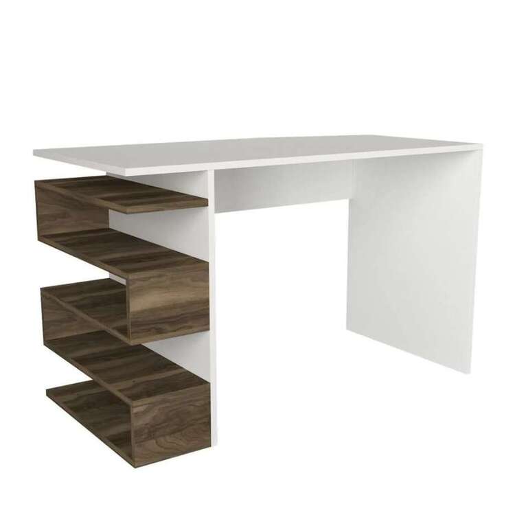 Písací stůl je vyroben z kvalitního LTD materiálu s tloušťkou 18 mm, což zajišťuje jeho pevnost a dlouhou životnost. Elegantní kombinace bílé barvy a ořechového dekoru dodává stolu moderní a sofistikovaný vzhled, který se hodí do jakéhokoliv interiéru. Stůl je vybaven praktickým regálkem, který poskytuje dostatek úložného prostoru pro vaše pracovní potřeby a pomůcky.