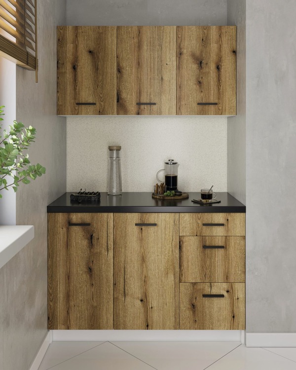 Malá kuchyňská linka v přírodním barevném provedení a jednoduchém designu. Tato elegantní kuchyně je cenově výhodná a díky svému nadčasovému designu bude moderní io několik let.Skříňky kuchyňské linky jsou vyrobeny z kvalitní 16 mm LTD desky. Černé 128 mm úchyty doplňují moderní charakter.