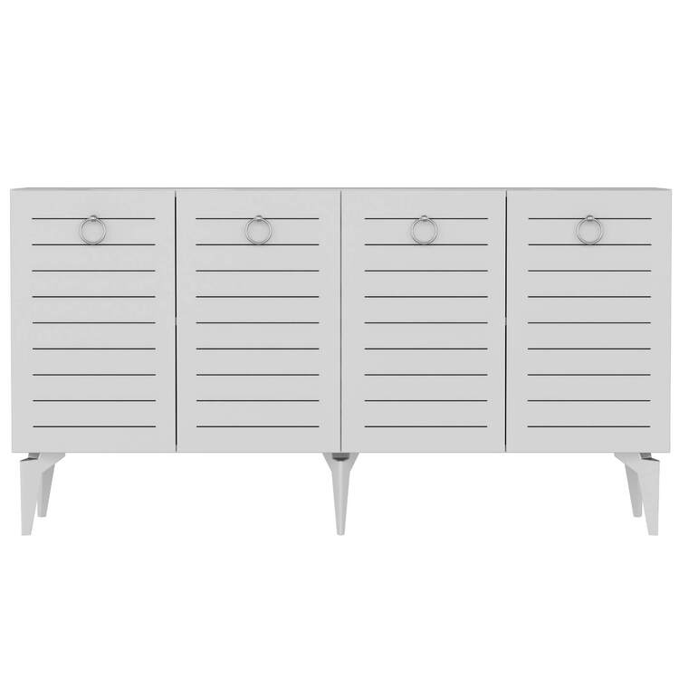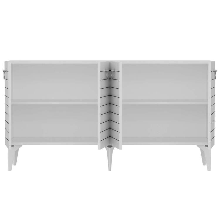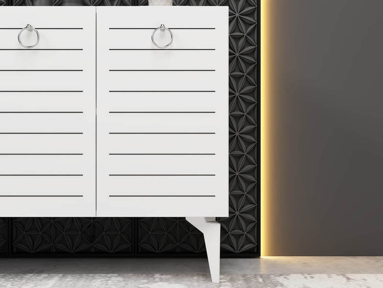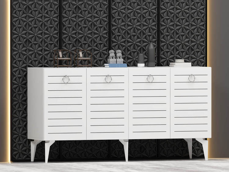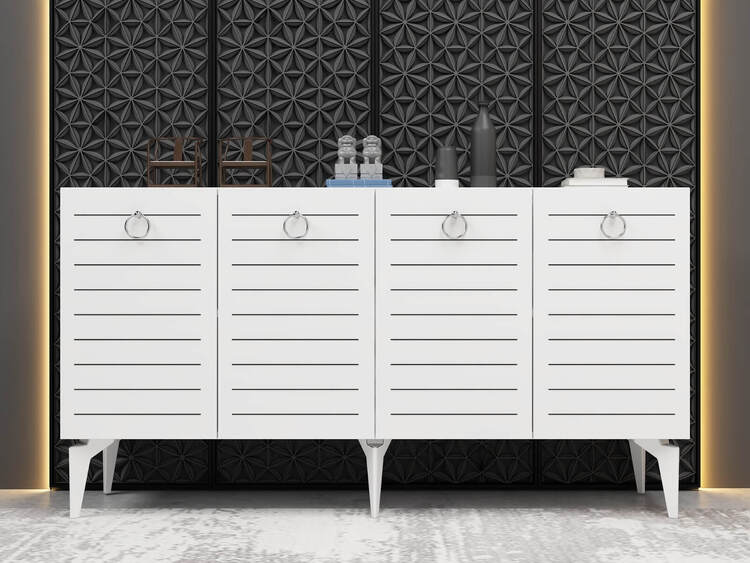 Komoda je ideálním doplňkem pro moderní obývací pokoj, který kombinuje praktické úložné prostory s elegantním designem. Díky čtyřem plným dvířkům nabízí dostatek místa pro všechny vaše potřeby, ať už jde o knihy, dekorace nebo jiné předměty.