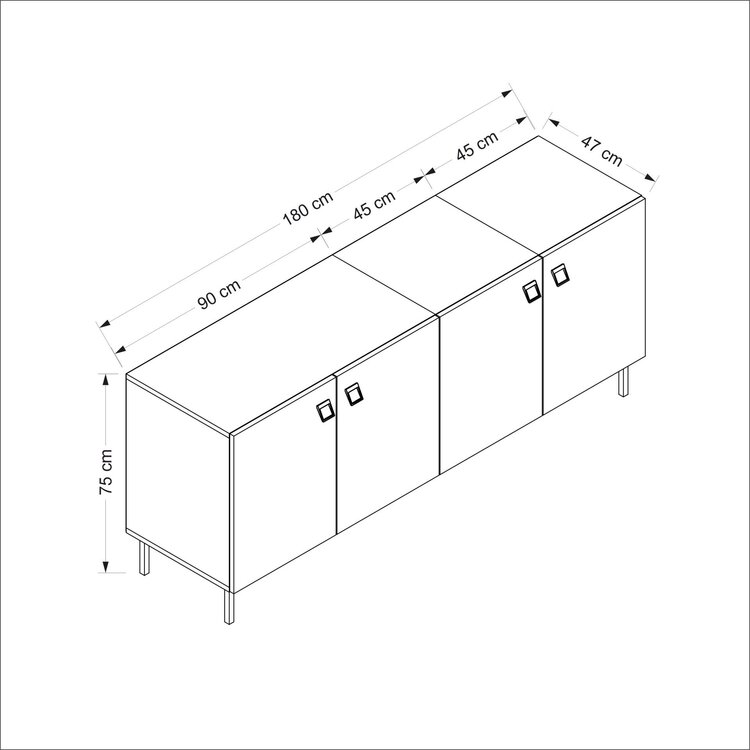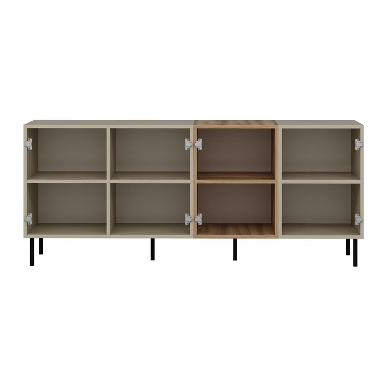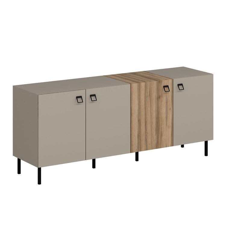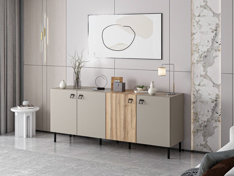 Komoda v moderní barvě pískovce je ideálním řešením pro ty, kteří hledají elegantní úložný prostor do svého obývacího pokoje. Široká konstrukce a čtyři plná dvířka poskytují dostatek prostoru pro organizaci věcí, zatímco její minimalistický design dokonale zapadne do každého interiéru.