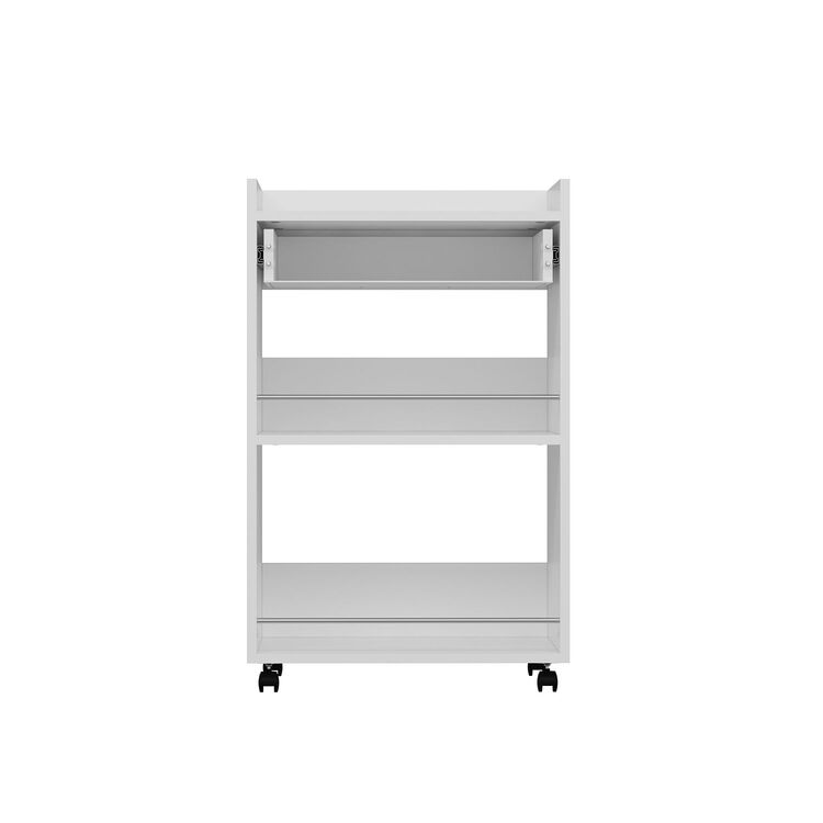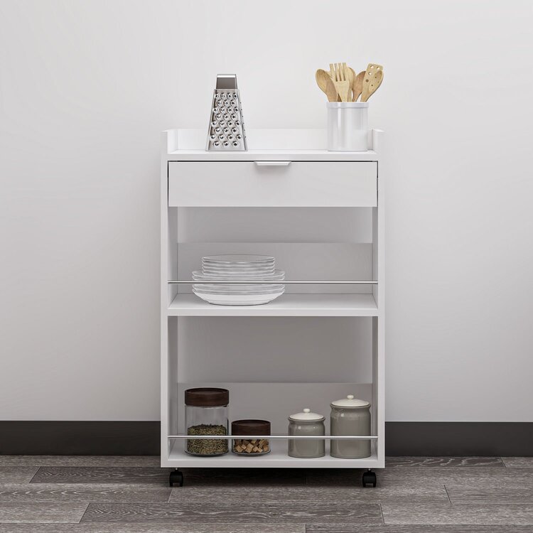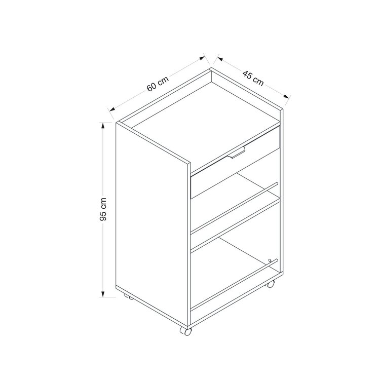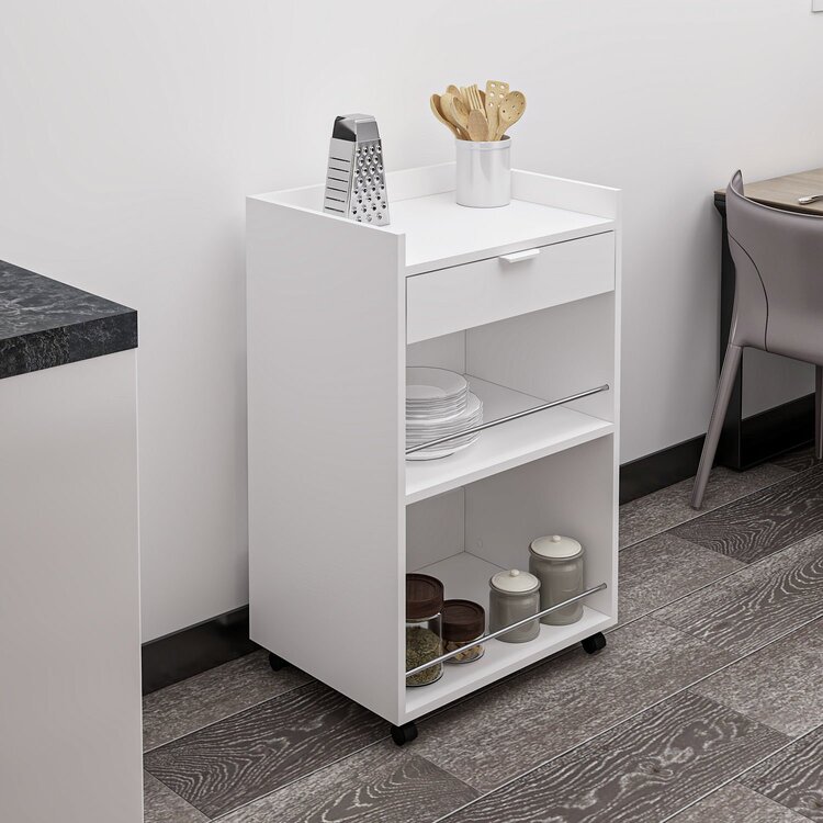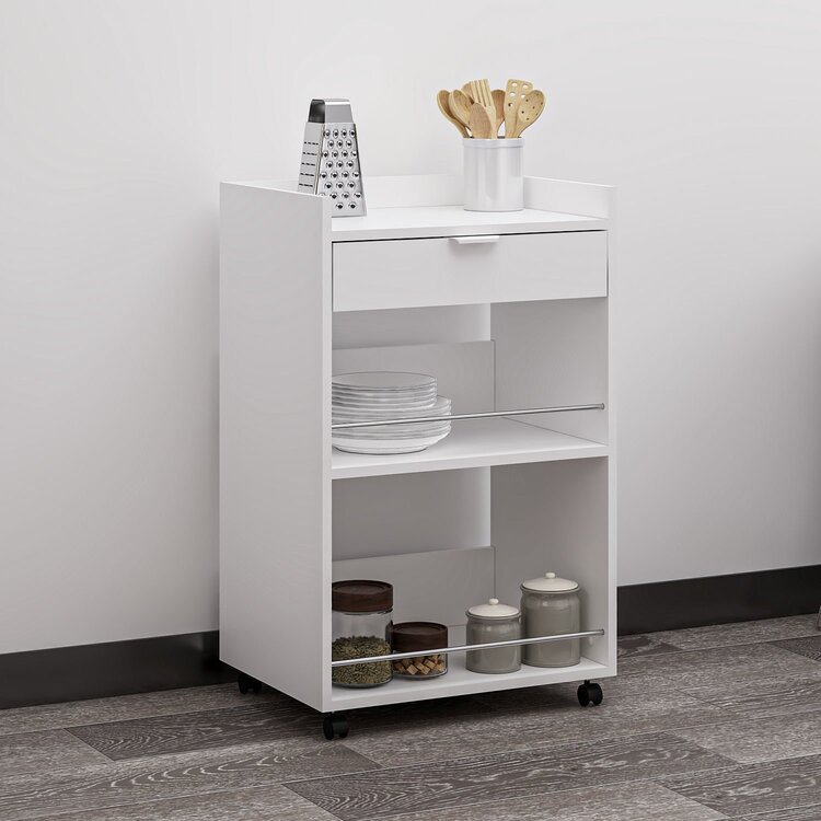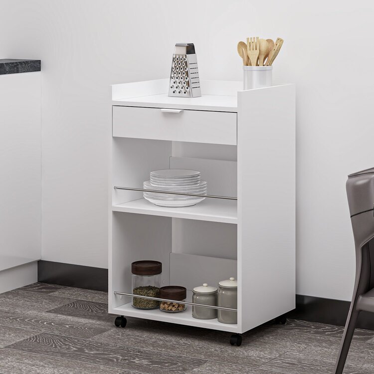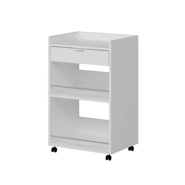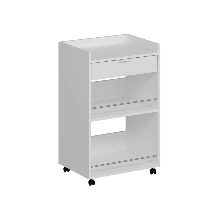 Regál na kolečkách je elegantní a víceúčelový kus nábytku, který skvěle zapadne do moderní kuchyně nebo obývacího pokoje. Jeho skandinávský design v bílé barvě nabízí čistý a minimalistický vzhled, zatímco zásuvka a odkládací police zajišťují dostatek úložného prostoru pro vaše potřeby.
