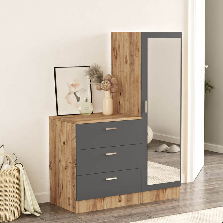Předsíňová sestava obsahuje jednu dveřní komodu o rozměrech 404772 cm a šatní skříňku se zrcadlem o rozměrech 4047140 cm. Takové složení Vám nabízí vynikající prostor pro uložení Vašich věcí a oblečení.