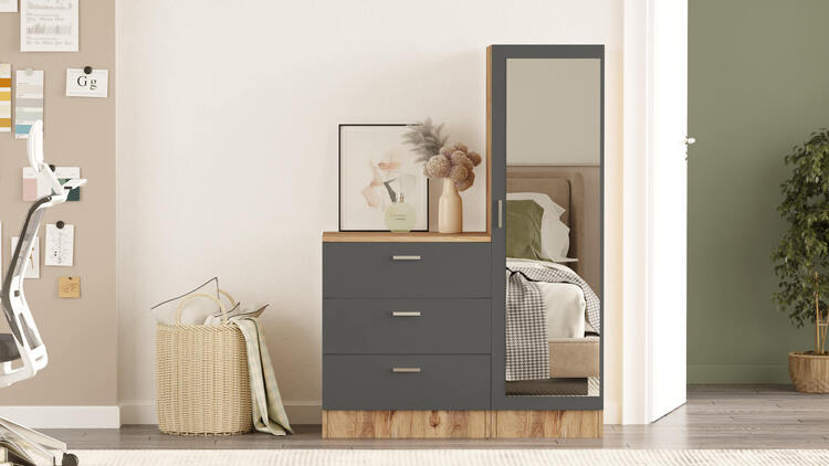 Moderní styl a design této sestavy vytváří příjemnou atmosféru a doplní každý interiér. Barva borovice v kombinaci s antracitem dodává nábytku sofistikovaný vzhled, který osloví každého.