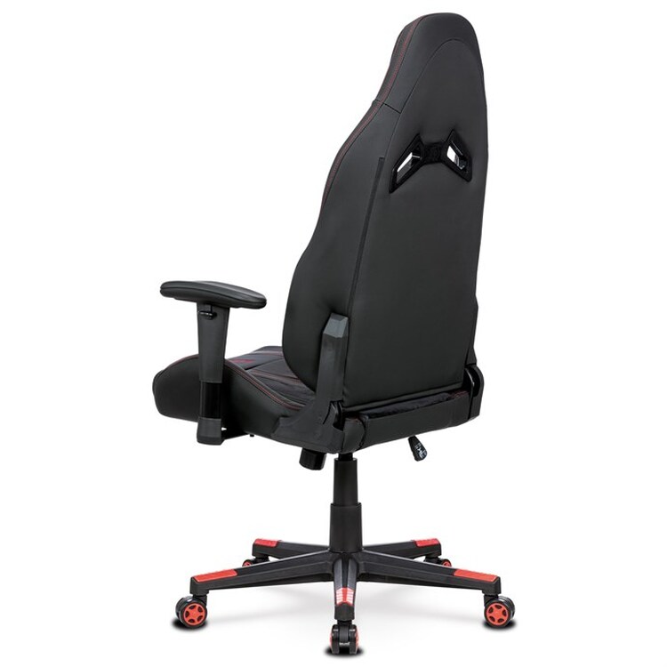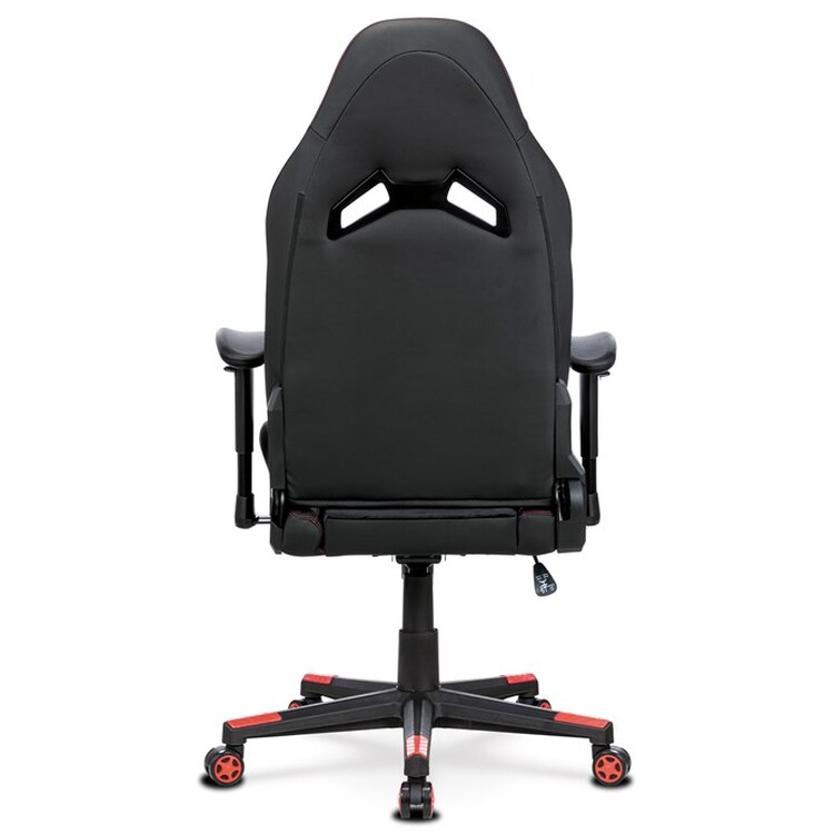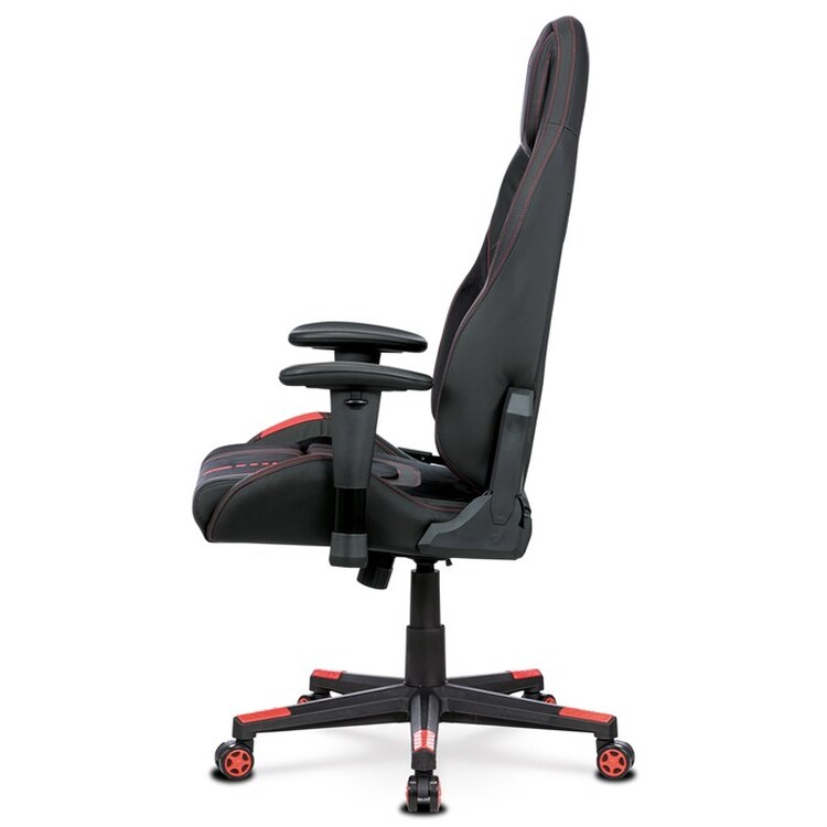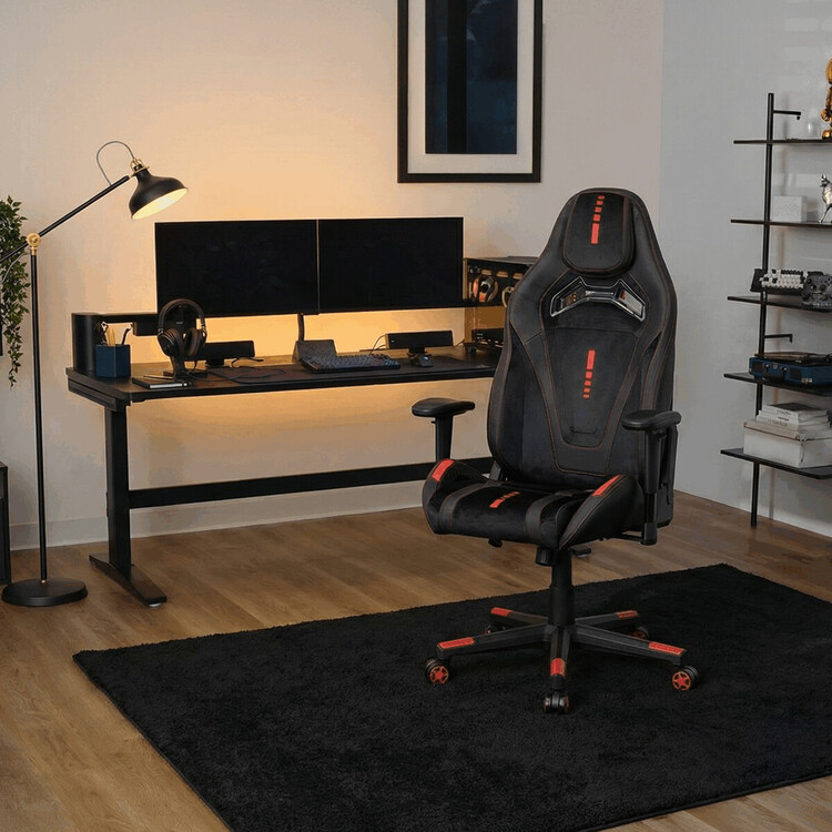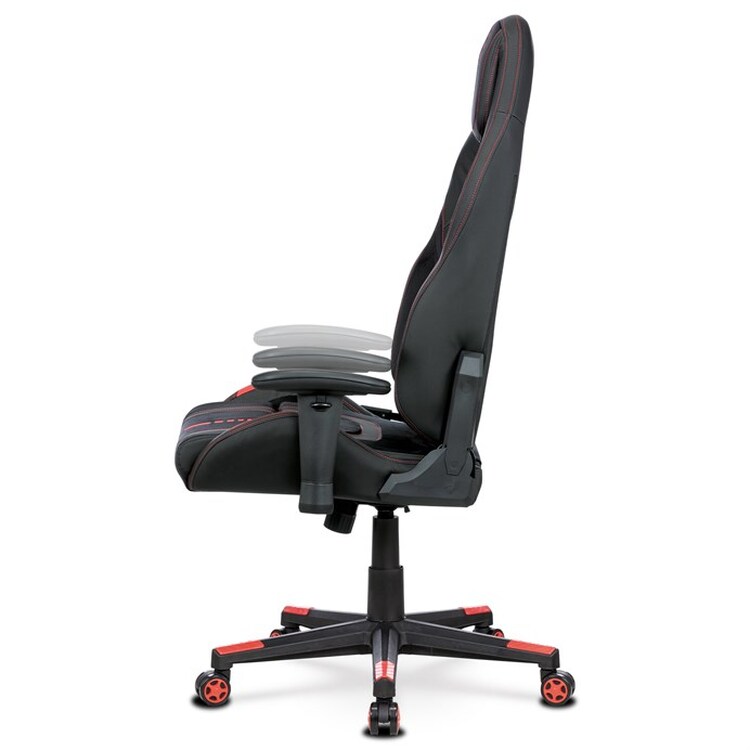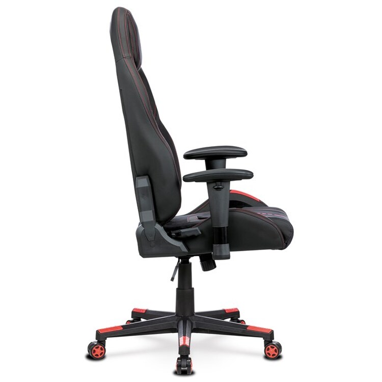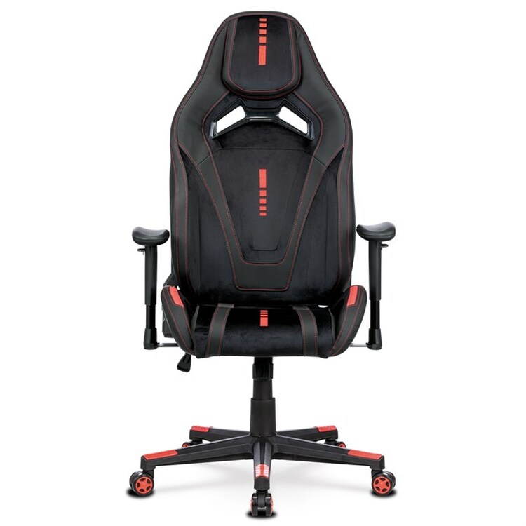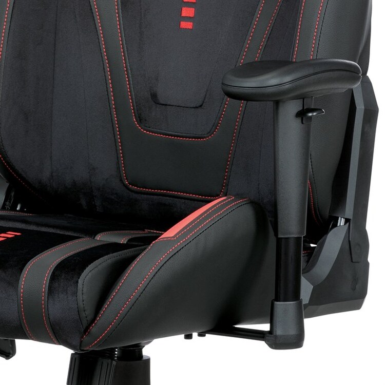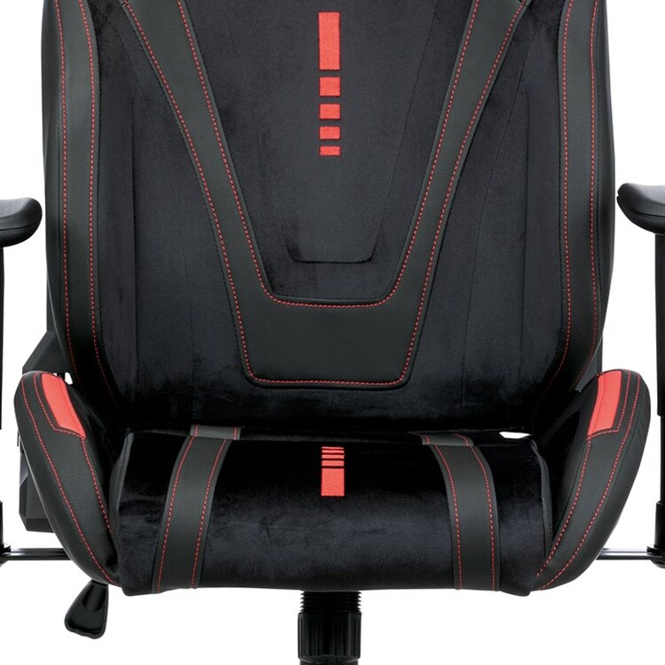Herní křeslo E-racer v černé barvě kombinuje sametovou látku s ekokůží, což zajišťuje příjemný dotek a snadnou údržbu. Pevná plastová podnož je vybavena pěti kolečky pro snadnou mobilitu a stabilitu. Křeslo disponuje houpacím mechanismem umožňujícím nastavení opěradla až do polohy 180°, což přispívá k maximálnímu pohodlí během dlouhých herních sezení. Výškově nastavitelné sedadlo a jednosměrné 1D područky umožňují přizpůsobení podle individuálních potřeb uživatele. Celkový design s výrazným červeným prošitím a ergonomickým tvarem opěradla podporuje správné držení těla a komfort při práci i hraní.
