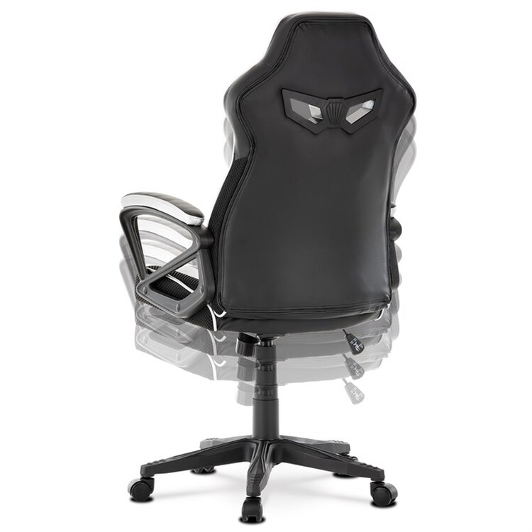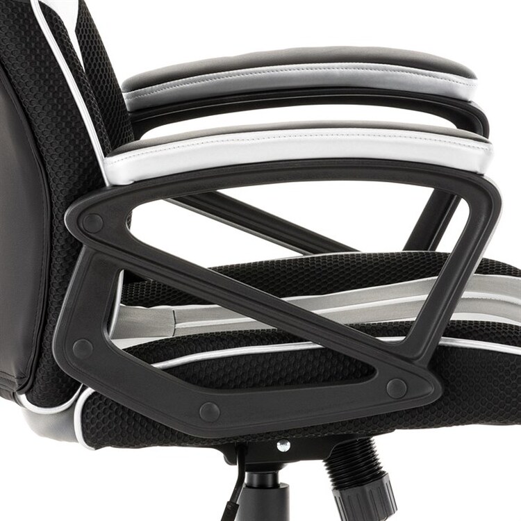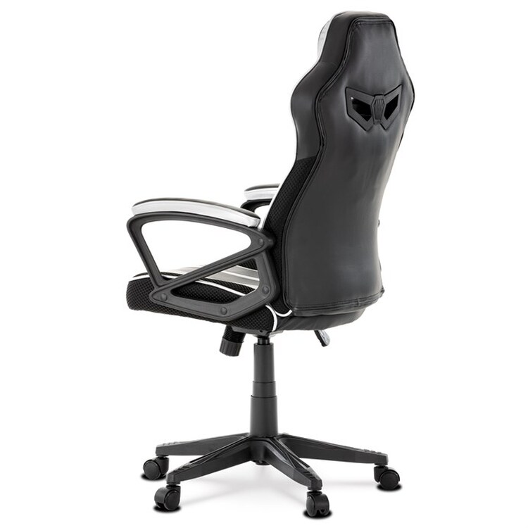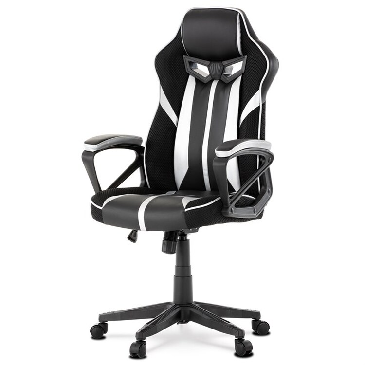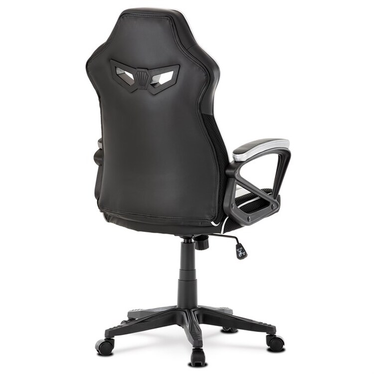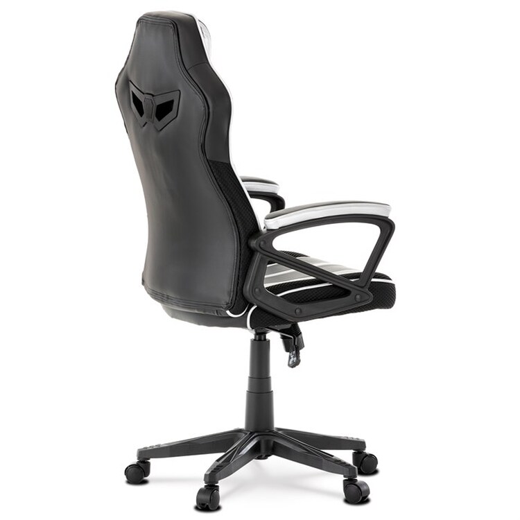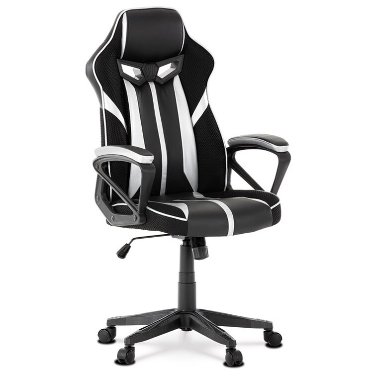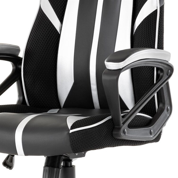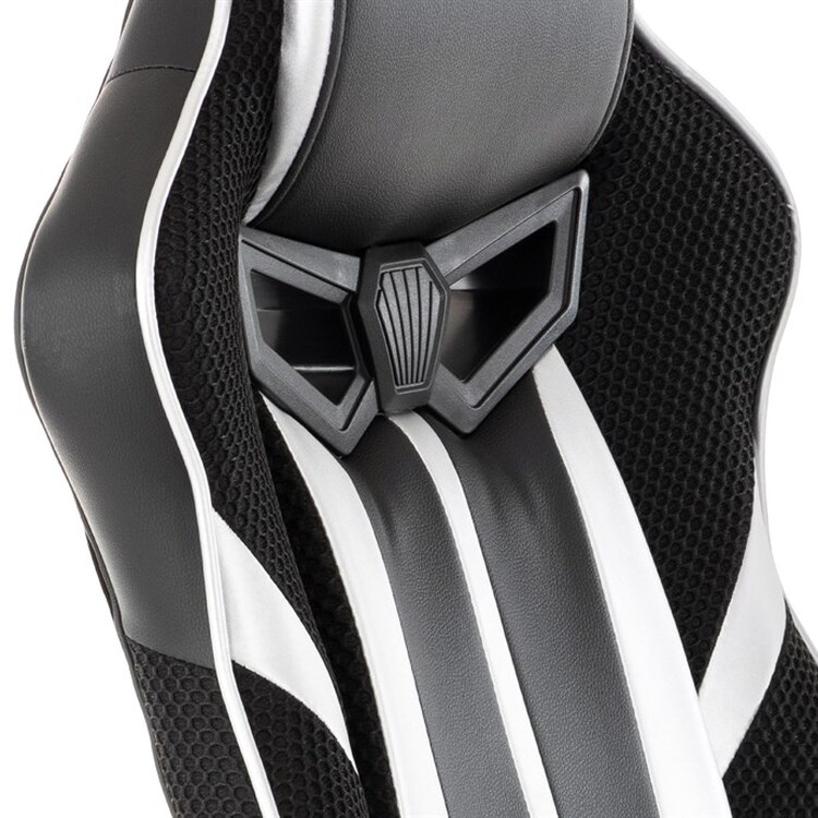 Herní křeslo s potahem z kombinace černé a stříbrné ekokůže a prodyšné černé látky MESH nabízí ergonomicky tvarované opěradlo a vysoké polstrování sedáku pro dlouhodobý komfort při hraní i práci. Odklápěcí čalouněné područky zajišťují pohodlnou oporu paží a zároveň možnost snadného přizpůsobení prostoru. Křeslo je vybaveno houpacím mechanismem, který umožňuje mírné naklánění pro uvolnění svalstva, a plastovým křížem s pěti kolečky pro stabilitu a snadnou mobilitu. Celkové provedení je navrženo pro dlouhou životnost a snadnou údržbu, přičemž absence bederní opěrky a posuvného sedáku zjednodušuje design a ovládání. Nosnost a rozměry nejsou specifikovány, ale konstrukce odpovídá standardům herních křesel v této kategorii.