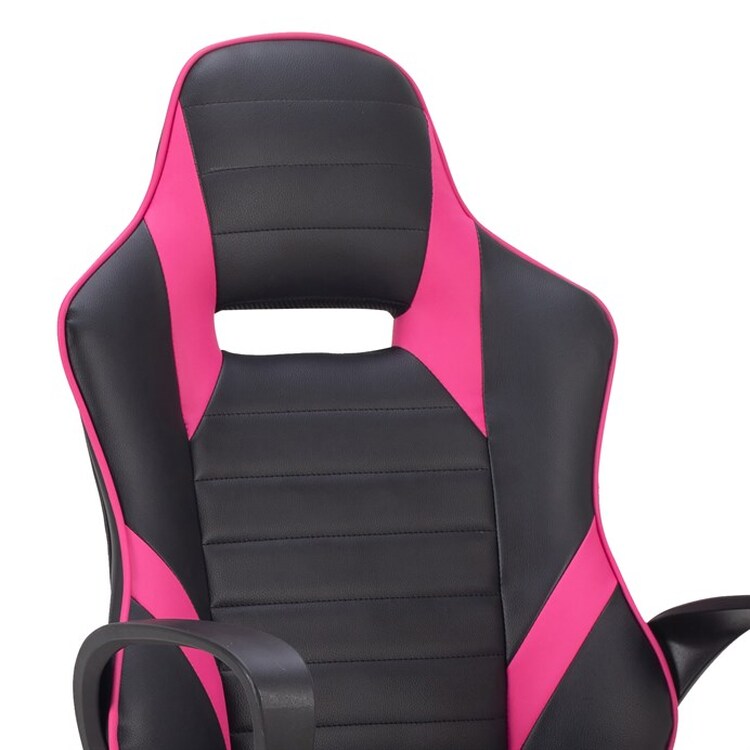 Herní křeslo s potahem z kombinace černé a růžové ekokůže nabízí ergonomicky tvarovaný design, který podporuje pohodlné sezení i během dlouhých herních sezení. Vysoké polstrování sedáku a opěradla zajišťuje dostatečnou oporu a komfort, zatímco pevné područky přispívají k stabilitě a pohodlí rukou. Křeslo je vybaveno houpacím mechanismem pro možnost mírného naklánění a výškově nastavitelným sedákem, což umožňuje individuální přizpůsobení výšky podle potřeby uživatele. Plastový kříž s kolečky umožňuje snadnou mobilitu po různých typech podlahových krytin. Celkově je křeslo navrženo s důrazem na kvalitní zpracování a dlouhou životnost.