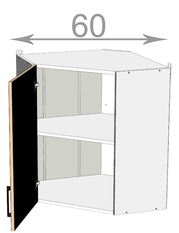 Horní rohová skříňka, šířka 60 cm, 1 dvířka, MDF, šikmý roh bordó lesk, bílý korpus. Náleží do kuchyňské sektorové řady Kaiser. Skříňka zabere roh o velikosti 60 × 60 cm. Boční stěny jsou široké 30 cm, takže vedle ní lze umístit ostatní horní skříňky, aby navazovaly. Skříňka má šikmý roh, jiným typem horní rohové skříňky je pak skříňka se skládacími dveřmi do pravého úhlu. Moderní, exkluzivní, ale cenově dostupný. To jsou hlavní přednosti kuchyňského sektoru Kaiser. MDF dvířka jsou potažena HPL vysokotlakým laminátem a mají plastovou hranu ve shodné barvě, což zaručuje vysokou odolnost a výdrž. Nově je možné si vybrat z více než 10ti barev dvířek jak v lesku tak iv matné úpravě. Úchytka je na výběr, ostatní kování je v ceně. Na výběr je mnoho skříněk, ze kterých je možné si vytvořit vlastní sestavu podle potřeby. Horní skříňky mají v ceně očka pro zavěšení na zeď. Regulovatelné závěsy lze dokoupit z naší nabídky. Úchytky ke skříňce se objednávají zvlášť. Na výběr je více než 10 typů úchytek, takže lze vybrat dle vašeho vkusu. Dvířka jsou již předvrtána na rozteč 128 mm.