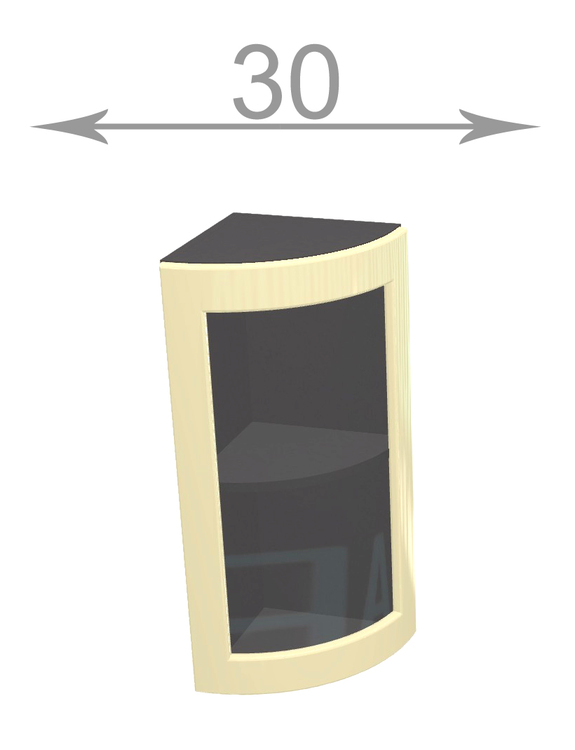 Horní rohová vitrína, šířka 30 cm, 1 dvířka, MDF, kulaté černý lesk, bílý korpus. Náleží do kuchyňské sektorové řady Premiere. Skříňka se umisťuje na konec kuchyně jako zakončení řady horních skříněk. Má velmi atraktivní zakulacená prosklená dvířka. Stylový, ale cenově dostupný. To je... více informací o zboží