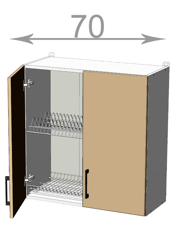Horní skříňka s odkapávačem, šířka 70 cm, 2 dvířka šedý jíl, grafit korpus. Náleží do kuchyňské sektorové řady Horizon. Uvnitř skříňky je vestavěný odkapávač na nádobí. Cenově atraktivní kuchyňský sektor Horizon ve vintage stylu je vyroben z odolného LTD. Úchytka je na výběr, ostatní kování je v ceně. Z jednotlivých skříněk je možno poskládat si sestavu na míru své kuchyně. Horní skříňky mají v ceně očka pro zavěšení na zeď. Regulovatelné závěsy lze dokoupit z naší nabídky. Úchytky ke skříňce se objednávají zvlášť. Na výběr je více než 10 typů úchytek, takže lze vybrat dle vašeho vkusu. Dvířka jsou již předvrtána na rozteč 128 mm.