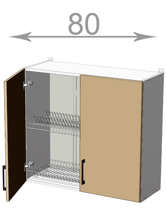 Horní skříňka s odkapávačem, šířka 80 cm, 2 dvířka bílý mat, bílý korpus. Náleží do kuchyňské sektorové řady Modena. Uvnitř skříňky je vestavěný odkapávač na nádobí. Cenově výhodná kuchyňská řada Modena má dvířka z kvalitního LTD. Úchytku je možno si vybrat, další kování je v ceně. Z sektoru Modena je možno poskládat si kuchyňskou linku na míru své místnosti. Horní skříňky mají v ceně očka pro zavěšení na zeď. Regulovatelné závěsy lze dokoupit z naší nabídky. Úchytky ke skříňce se objednávají zvlášť. Na výběr je více než 10 typů úchytek, takže lze vybrat dle vašeho vkusu. Dvířka jsou již předvrtána na rozteč 128 mm.