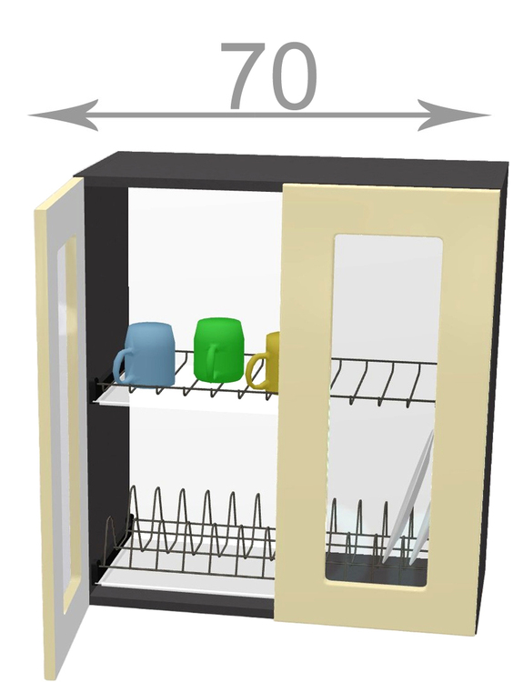 Horní vitrína s odkapávačem, šířka 70 cm, 2 dvířka, MDF bílý dub polar, bílý korpus. Náleží do kuchyňské sektorové řady Premiere. Uvnitř skříňky je vestavěný odkapávač na nádobí. Stylový, ale cenově dostupný. To je kuchyňský sektor Premiere s dvířky z kvalitní MDF, potaženými odolnou PVC fólií... více informací o zboží