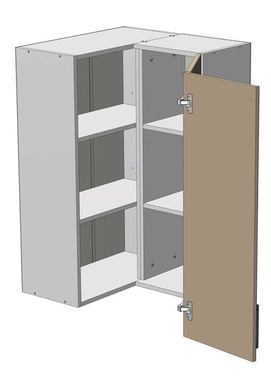 Horní vysoká rohová skříňka, šířka 60 cm, 2 dvířka, lomená šedá činčila, grafit korpus. Náleží do kuchyňské sektorové řady Modena. odolného LTD.V ceně je příslušné kování z jednotlivých skříněk je možné si vyskládat kuchyni na míru. předvrtané na rozteč 128 mm.