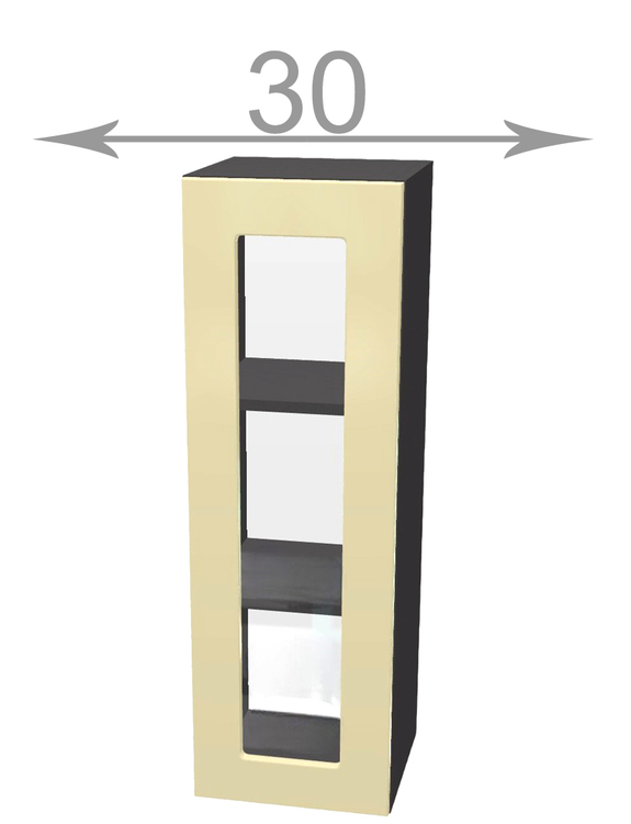 Horní vysoká vitrína, šířka 30 cm, 1 dvířka antracit, bílý korpus. Náleží do kuchyňské sektorové řady Modena. Skříňka o výšce 92 cm do vyšší zástavby horních skříněk. Cenově výhodná kuchyňská řada Modena má dvířka z kvalitního LTD. Úchytku je možno si vybrat, další kování je v ceně. Z sektoru Modena je možno poskládat si kuchyňskou linku na míru své místnosti. Horní skříňky mají v ceně očka pro zavěšení na zeď. Regulovatelné závěsy lze dokoupit z naší nabídky. Úchytky ke skříňce se objednávají zvlášť. Na výběr je více než 10 typů úchytek, takže lze vybrat dle vašeho vkusu. Dvířka jsou již předvrtána na rozteč 128 mm.