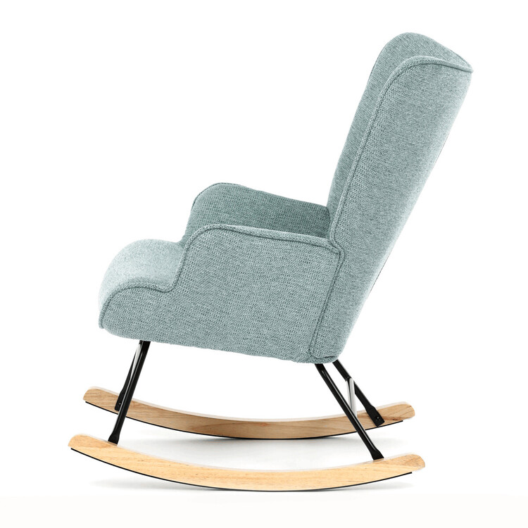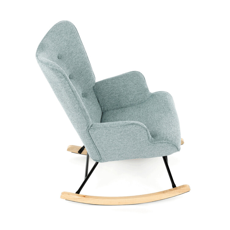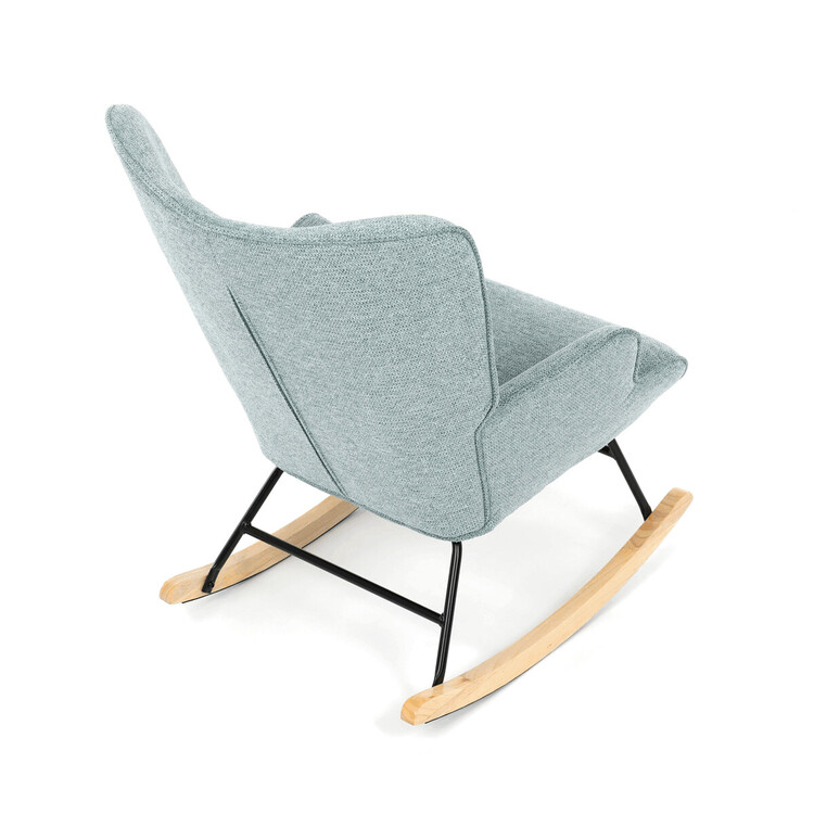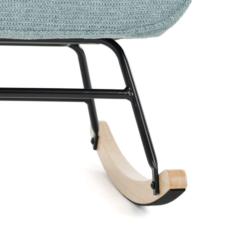 Houpací křeslo v modrém provedení je potažené prémiovou látkou, která nabízí příjemný dotek a snadnou údržbu. Sedák a opěradlo jsou ergonomicky tvarované pro pohodlné sezení, doplněné o pevné čalouněné područky. Stabilní nohy jsou vyrobeny z masivního kaučukovníku a doplněny o černý kovový rám, který zajišťuje pevnost a dlouhou životnost. Houpací mechanismus umožňuje plynulé houpání, které přispívá k relaxaci a odpočinku. Křeslo je určeno pro interiéry s důrazem na komfort a styl, jeho rozměry a nosnost odpovídají běžným standardům pro houpací křesla.