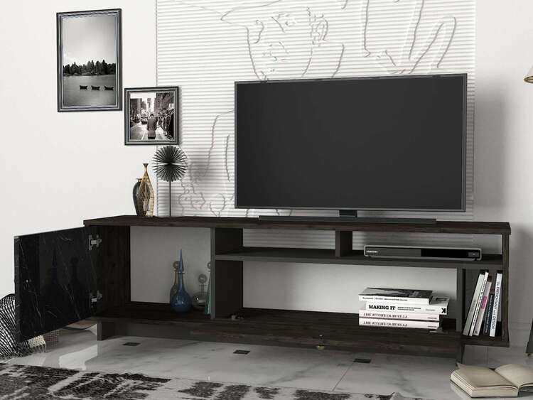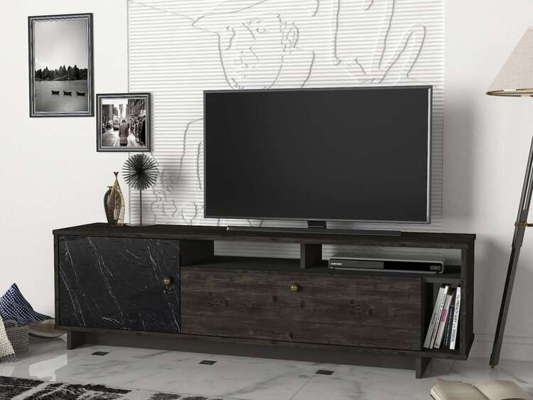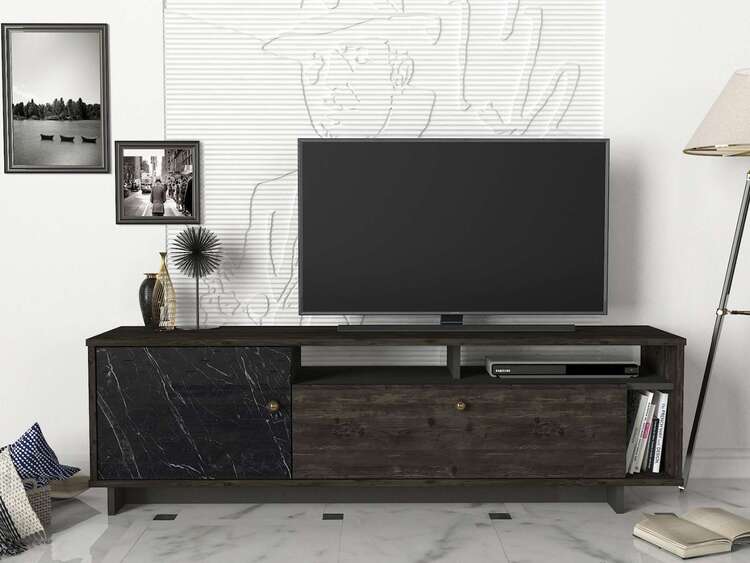 TV stolek je ideální volbou pro ty, kteří hledají luxusní a funkční nábytek s elegantním vzhledem. Jeho kombinace tmavě hnědé a mramorové barvy a minimalistický design přinášejí do vašeho domova svěžest a moderní styl, zatímco poskytují dostatek úložného prostoru pro všechny vaše potřeby.