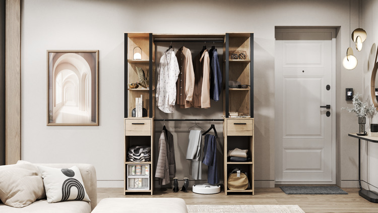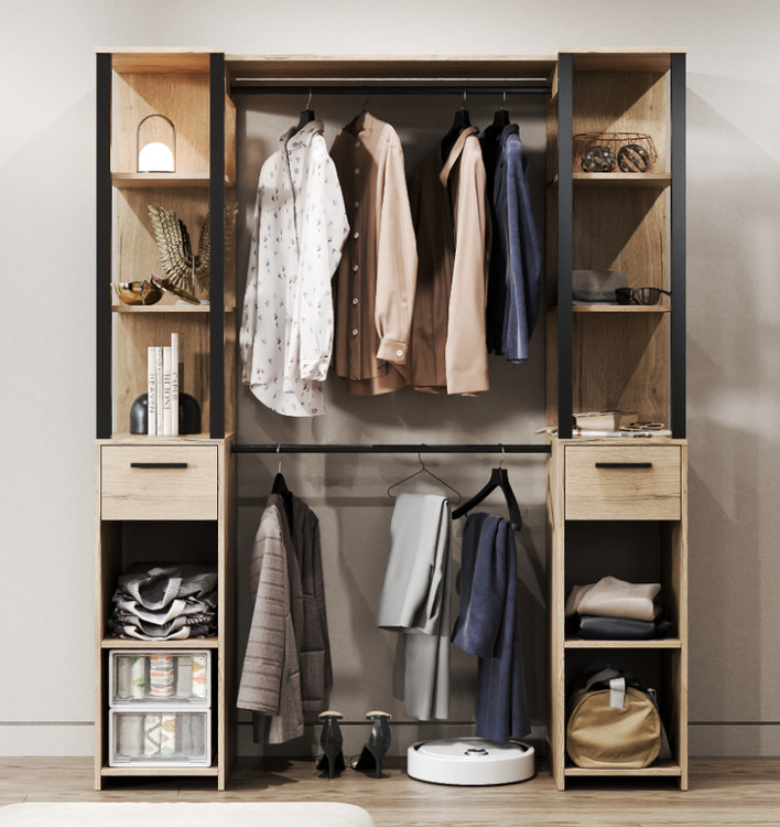 Šatna nabízí dostatek úložného prostoru díky 2 prostorným zásuvkám, otevřeným policím a 2 šatním tyčím, které umožňují přehledné uspořádání oblečení, kabátů či doplňků. Jeho otevřená konstrukce usnadňuje přístup a dodává interiéru vzdušný, elegantní vzhled.