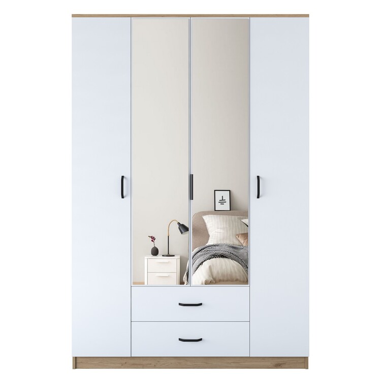 Šatní skříň nabízí vše potřebné pro přehledné uspořádání vašeho oblečení a doplňků. Obsahuje dvě zásuvky pro menší předměty, šatní tyč pro zavěšení oblečení a velké zrcadlo, které opticky zvětší prostor a dodá vaší ložnici moderní nádech.