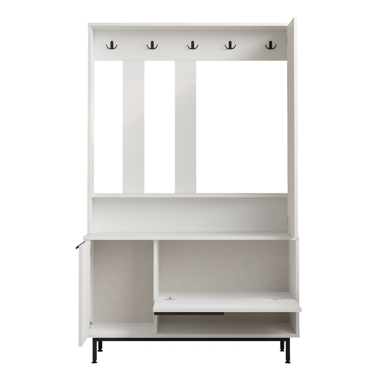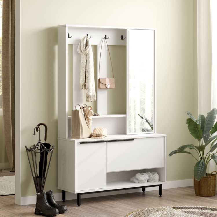 spojuje funkčnost a moderní estetiku. Věšáková stěna poskytuje prostor pro zavěšení kabátů a tašek, zatímco zrcadlo přidává do předsíně více světla a opticky zvětšuje prostor. Botník zajišťuje organizovaný a přehledný úložný prostor pro vaši obuv. Díky svému elegantnímu provedení se sestava hodí do každé moderní domácnosti.