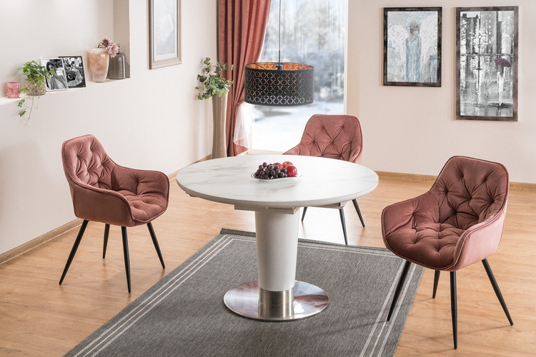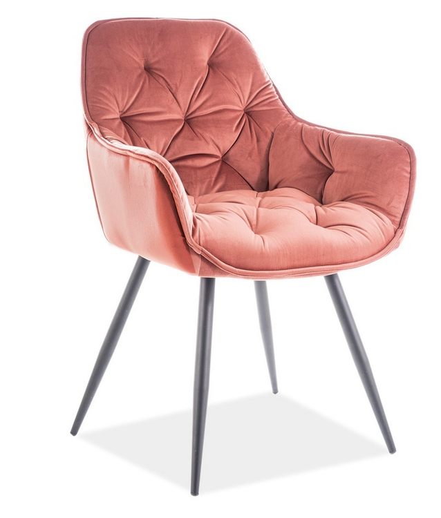 Atraktivní čalouněná židle – křeslo vhodná nejen do Vaší jídelny a kuchyně, ale také do kanceláře, čekárny či recepce. Konstrukce je z kovu černé barvy. Čalounění židle je z potahové látky aksamit (BLUVEL 52) ve starorůžové barvě. Dodáváme v demontovaném stavu.CASA 11009