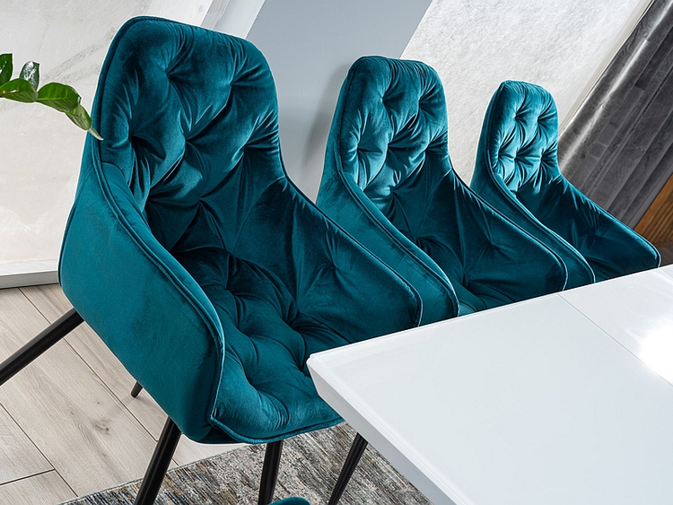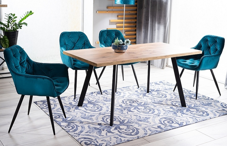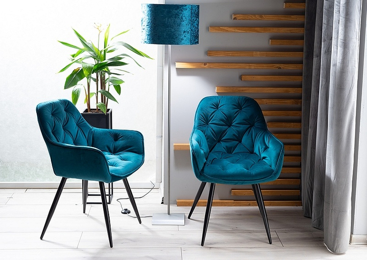 Atraktivní čalouněná židle – křeslo vhodná nejen do Vaší jídelny a kuchyně, ale také do kanceláře, čekárny či recepce. Konstrukce je z kovu černé barvy. Čalounění židle je z potahové látky aksamit (bluvel 85) v tyrkysové barvě. Dodáváme v demontovaném stavu.CASA 11009