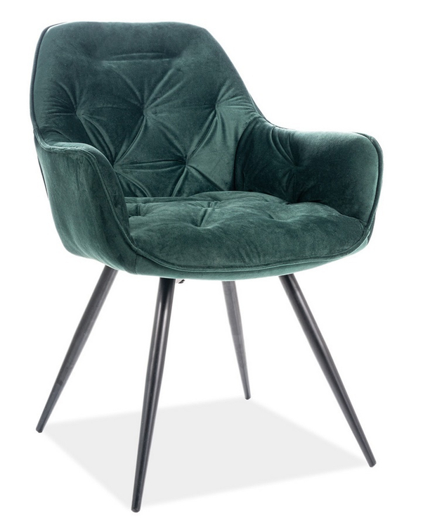 Elegantní čalouněná jídelní židle – křeslo s prošitím. Konstrukce je z kovu černé barvy. Čalounění židle je z potahové látky aksamit (BLUVEL 78) v zelené barvě. Dodáváme v demontovaném stavu.CASA 11009