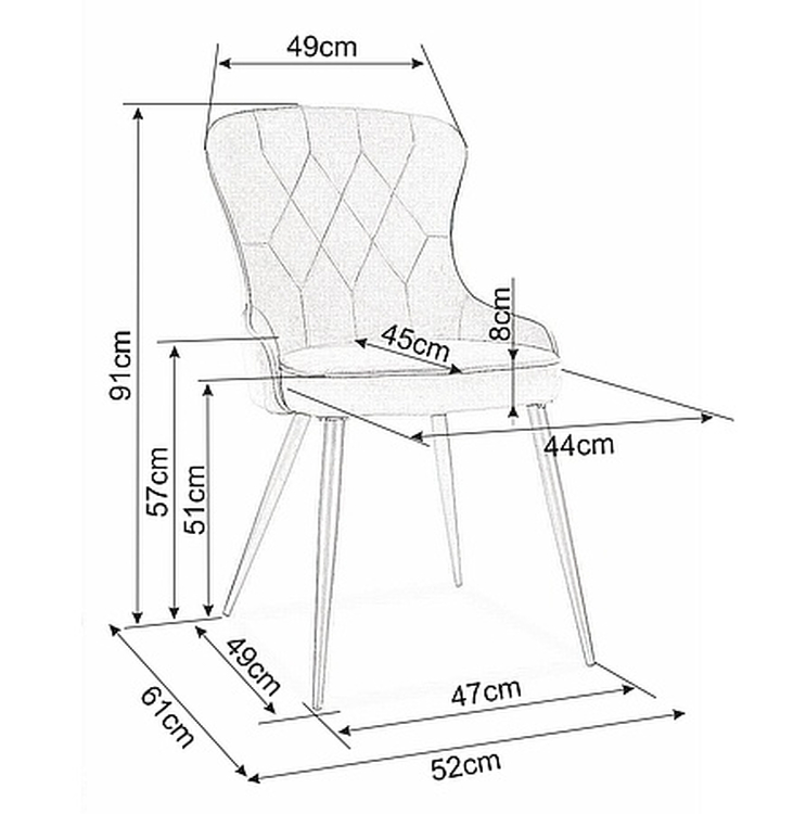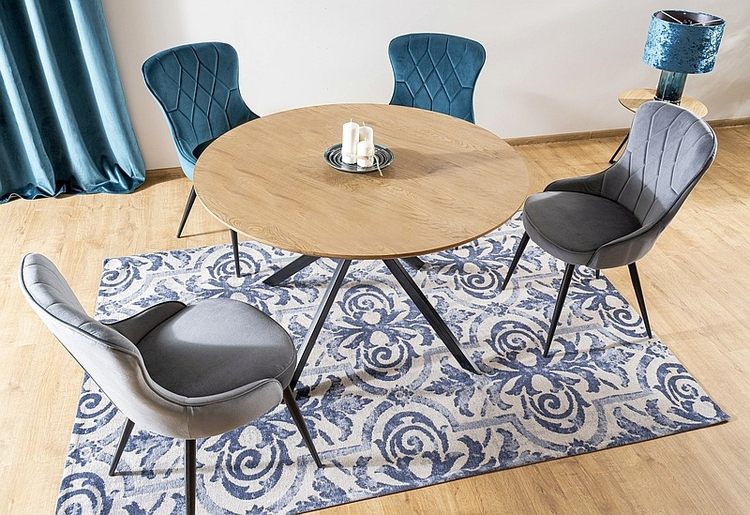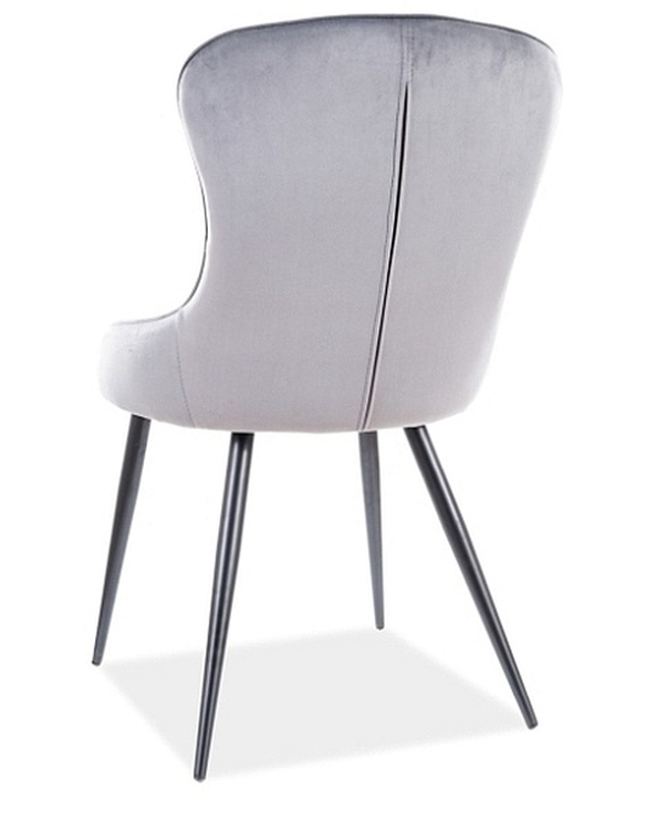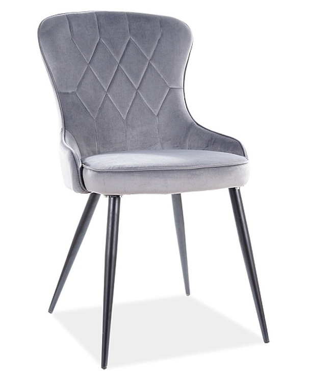 Elegantní čalouněná jídelní židle – křeslo. Konstrukce je z kovu černé matné barvy. Čalounění židle je z potahové látky aksamit v šedé barvě. Dodáváme v demontovaném stavu.CASA 11888