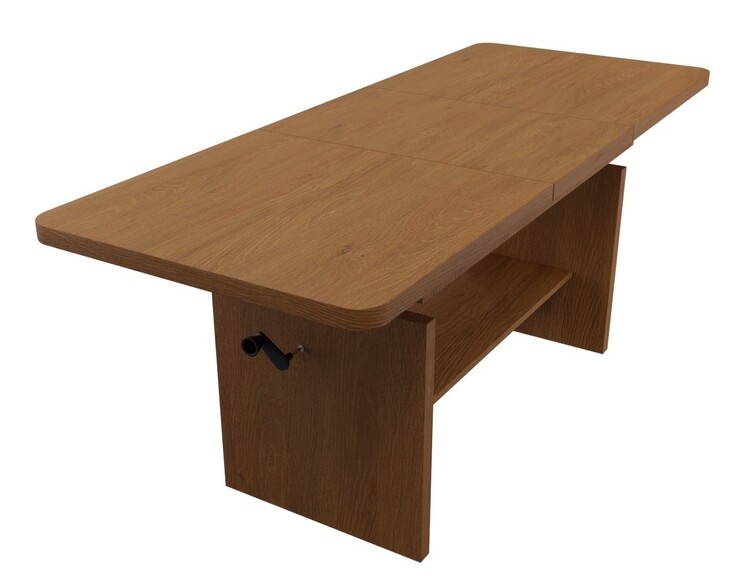 Elegantní konferenční stůl s funkcí jídelního stolu v moderním pojetí. Výhodou tohoto stolu je nastavitelná výška, kdy po zvýšení a rozkladu desky je možno ho použít ke stolování. Masivní deska je z LTD 32 mm opatřena ABS páskou 2 mm, otevírací mechanismus je vysoké kvality. Barevné provedení... více informací o zboží