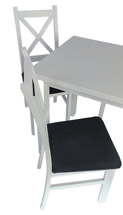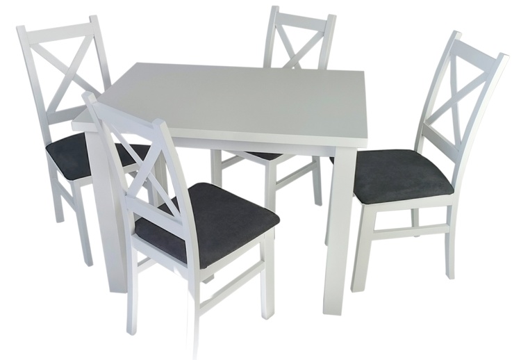 Jídelní sestava 1 stolu a 4 židlí. Deska jídelního stolu je vyrobena z LTD, nohy stolu jsou z materiálu MDF a konstrukce židlí z bukového dřeva, obojí v barvě bílá mat, vše hraněné ABS páskou. Židle má čalouněný sedák v látce Moric 8 (černá),výplň sedáku PUR pěna T30. Jednotlivé díly lze... více informací o zboží
