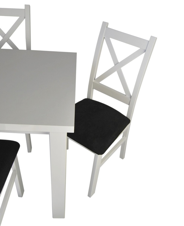 Jídelní sestava 1 stolu a 4 židlí. Deska jídelního stolu je vyrobena z LTD, nohy stolu jsou z materiálu MDF a konstrukce židlí z bukového dřeva, obojí v barvě bílá mat, vše hraněné ABS páskou. Židle má čalouněný sedák v látce Moric 8 (černá),výplň sedáku PUR pěna T30. Jednotlivé díly lze zakoupit zvlášť. Dodáváme v demontovaném stavu.CASA 44003+CASA 44001