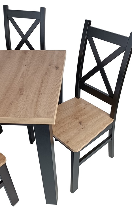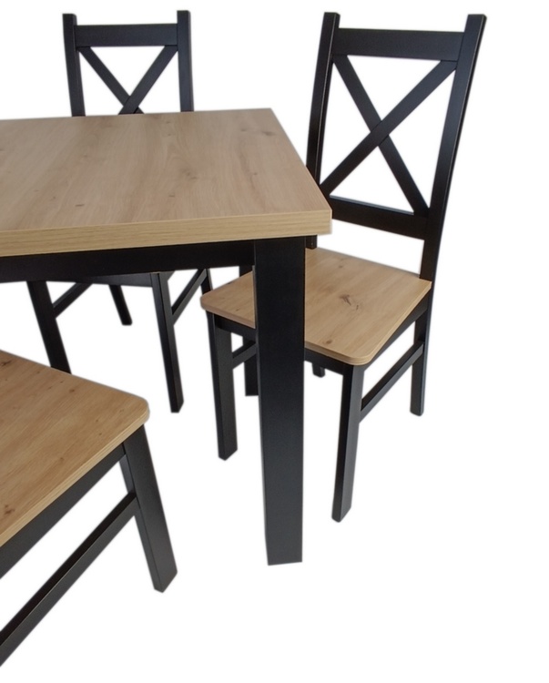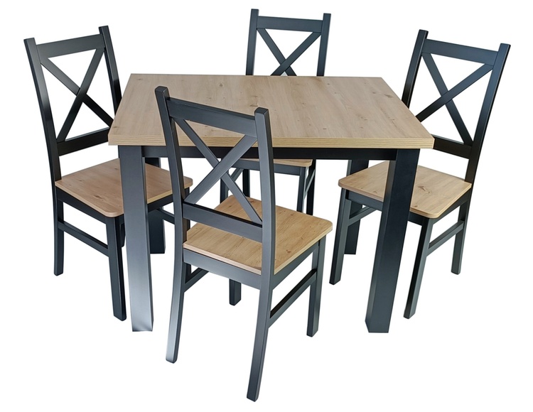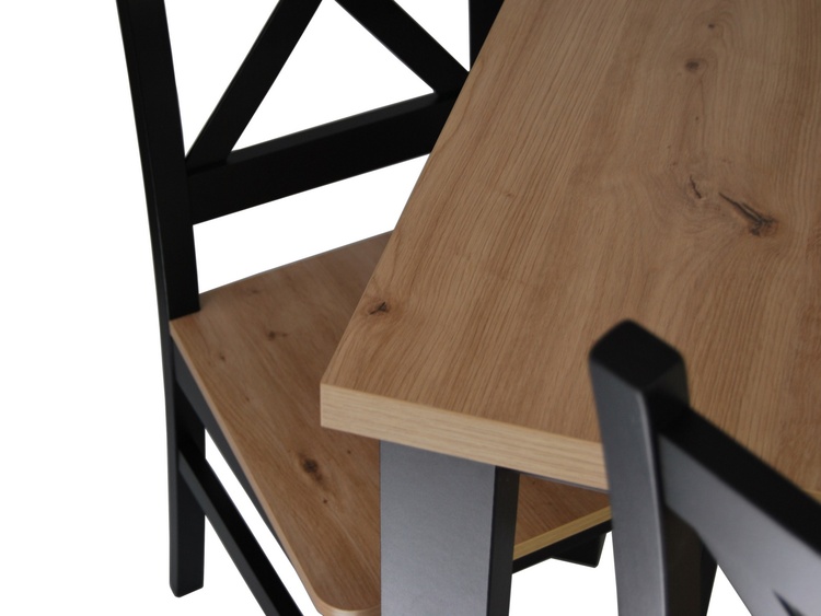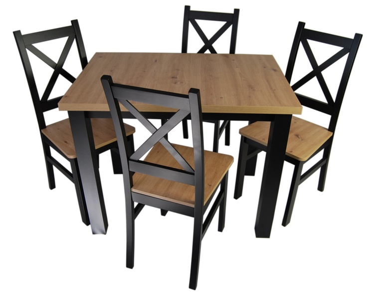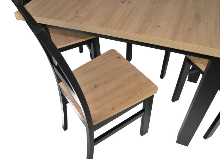Jídelní sestava 1 stolu a 4 židlí. Deska jídelního stolu je vyrobena z LTD, sedák u židle z HDF, obojí jsou v barvě dub artisan, nohy stolu jsou z materiálu MDF a konstrukce židlí z bukového dřeva, obojí v barvě černá mat, vše hraněné ABS páskou. Dodáváme v demontovaném stavu.CASA 44003+CASA 44001