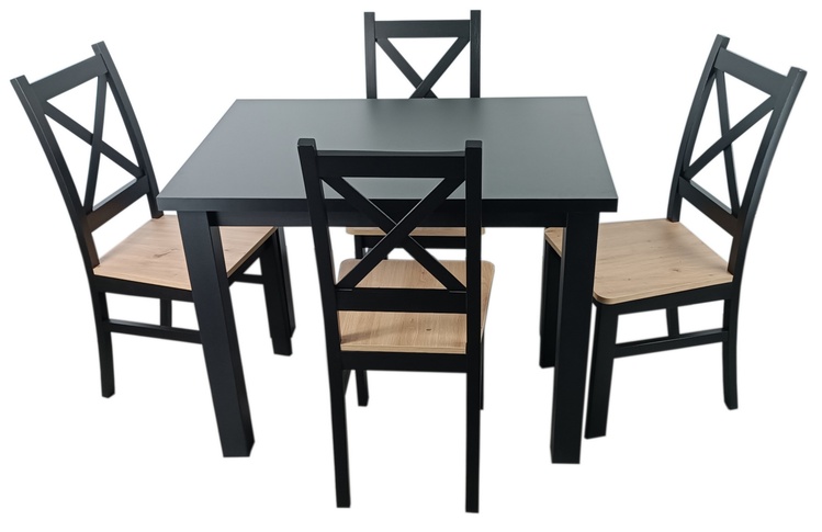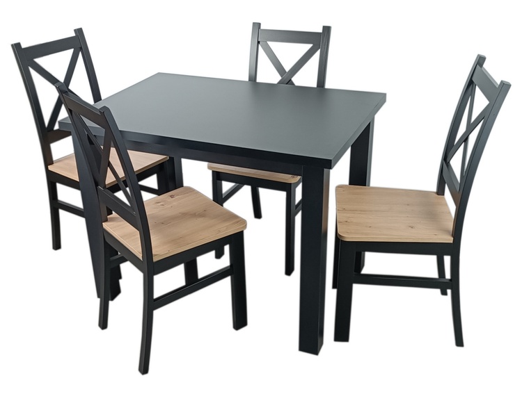 Jídelní sestava 1 stolu a 4 židlí. Deska jídelního stolu je vyrobena z LTD, nohy stolu jsou z materiálu MDF a konstrukce židlí z bukového dřeva, sedák z HDF, vše hraněné ABS páskou. Barva stolu je matná černá, židle je také černá mat se sedákem v barvě dub artisan. Jednotlivé díly lze zakoupit... více informací o zboží