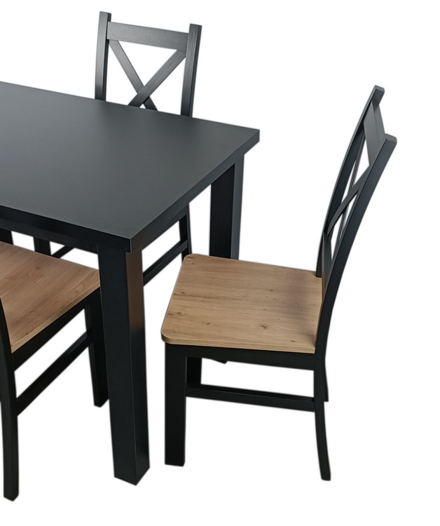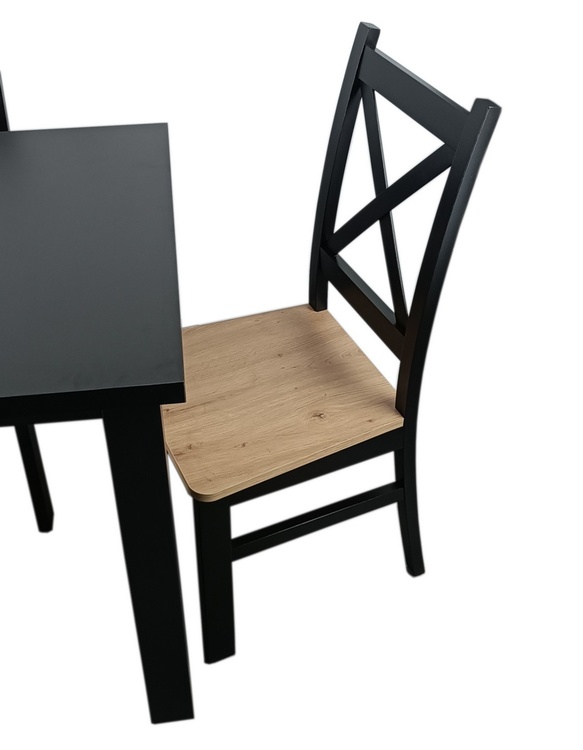 Jídelní sestava 1 stolu a 4 židlí. Deska jídelního stolu je vyrobena z LTD, nohy stolu jsou z materiálu MDF a konstrukce židlí z bukového dřeva, sedák z HDF, vše hraněné ABS páskou. Barva stolu je matná černá, židle je také černá mat se sedákem v barvě dub artisan. Jednotlivé díly lze zakoupit zvlášť. Dodáváme v demontovaném stavu.CASA 44003+CASA 44001