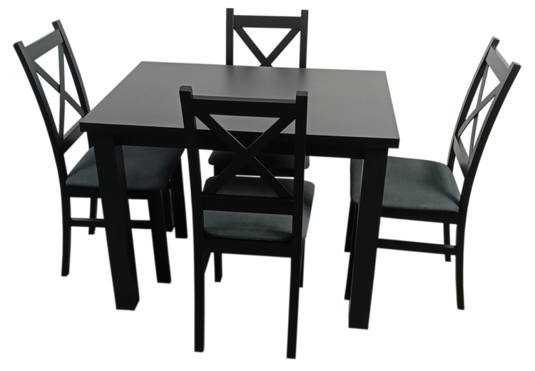 Jídelní sestava 1 stolu a 4 židlí. Deska jídelního stolu je vyrobena z LTD, nohy stolu jsou z materiálu MDF a konstrukce židlí z bukového dřeva, obojí v barvě černá mat, vše hraněné ABS páskou. Židle má čalouněný sedák v látce Moric 8 (černá),výplň sedáku PUR pěna T30. Jednotlivé díly lze zakoupit zvlášť. Dodáváme v demontovaném stavu.CASA 44003+CASA 44001