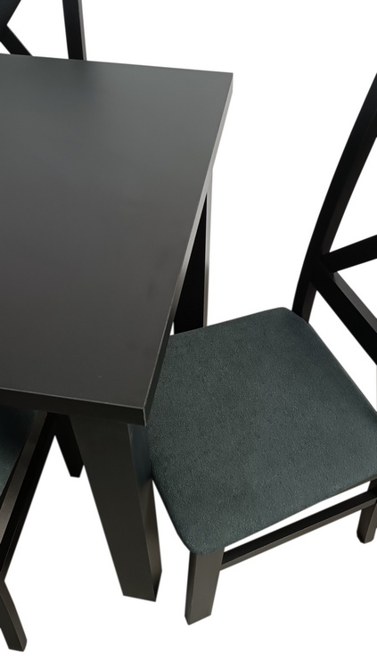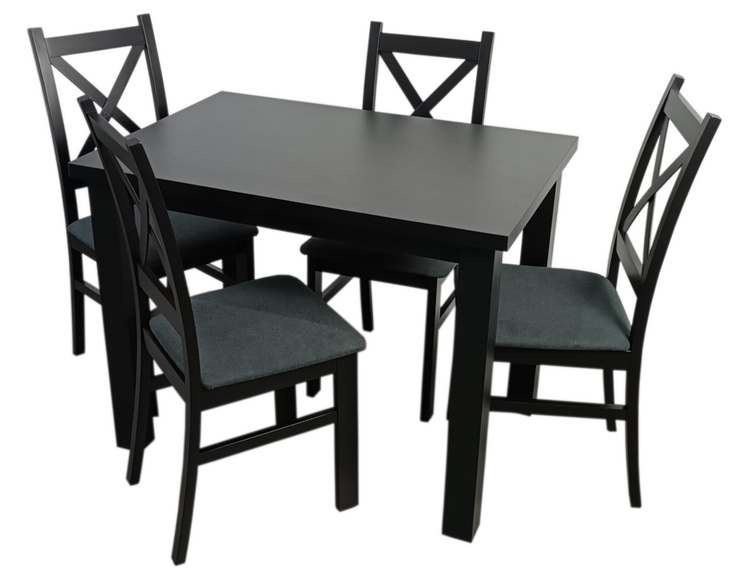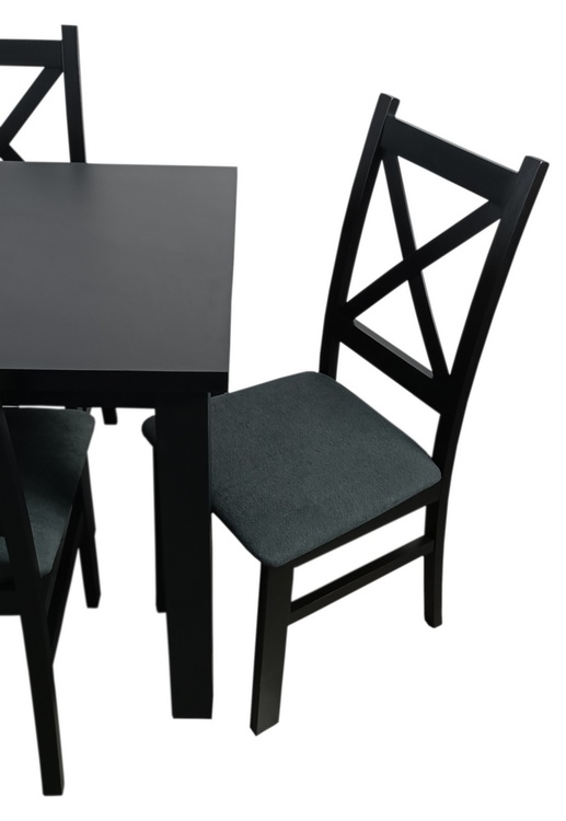 Jídelní sestava 1 stolu a 4 židlí. Deska jídelního stolu je vyrobena z LTD, nohy stolu jsou z materiálu MDF a konstrukce židlí z bukového dřeva, obojí v barvě černá mat, vše hraněné ABS páskou. Židle má čalouněný sedák v látce Moric 8 (černá),výplň sedáku PUR pěna T30. Jednotlivé díly lze... více informací o zboží