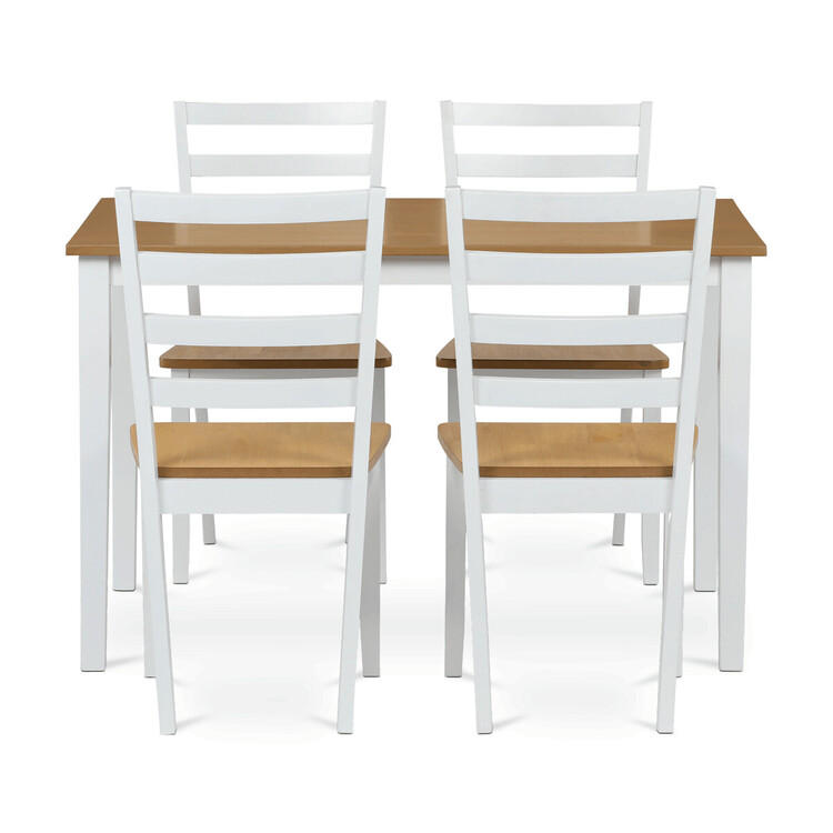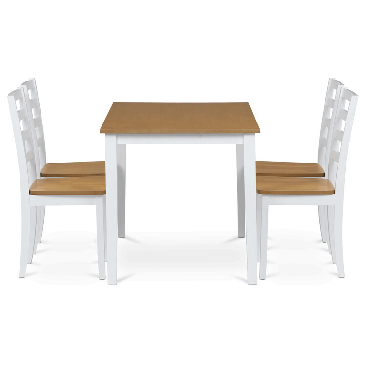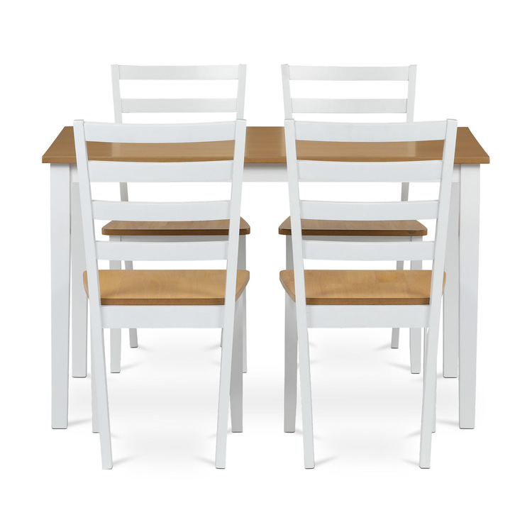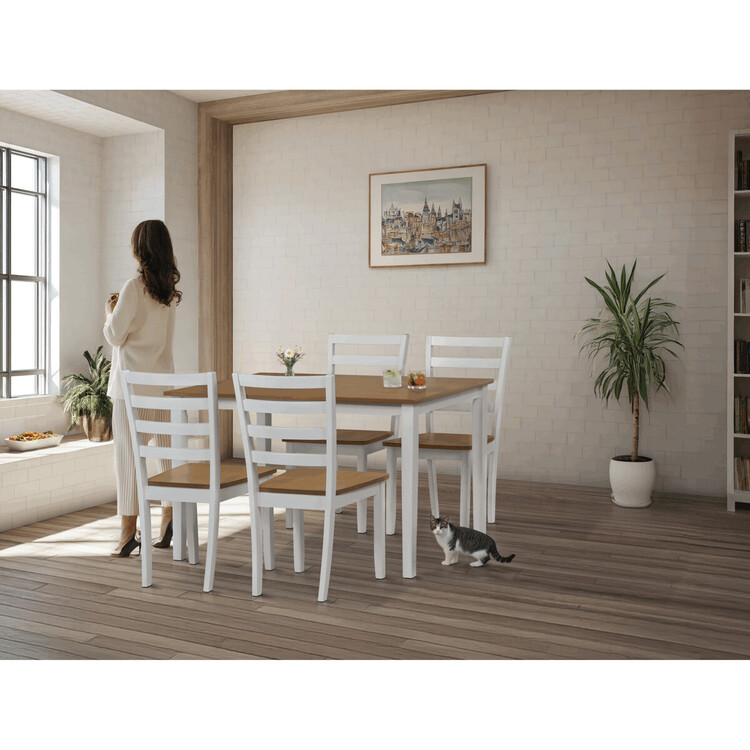 Vneste do svého domova harmonii s elegantním jídelním setem značky Autronic. Kombinace bílých masivních nohou a desky v přírodním dubovém dekoru přidá vašemu interiéru moderní a svěží vzhled. Set zahrnuje stůl a čtyři židle, které nabízí pohodlí a stabilitu díky preciznímu zpracování z MDF materiálu s dýhou a masivním dřevem. Tento jídelní set je ideální volbou pro rodinné večeře i posezení s přáteli. Vytvořte si stylovou a funkční jídelnu s nadčasovým designem!